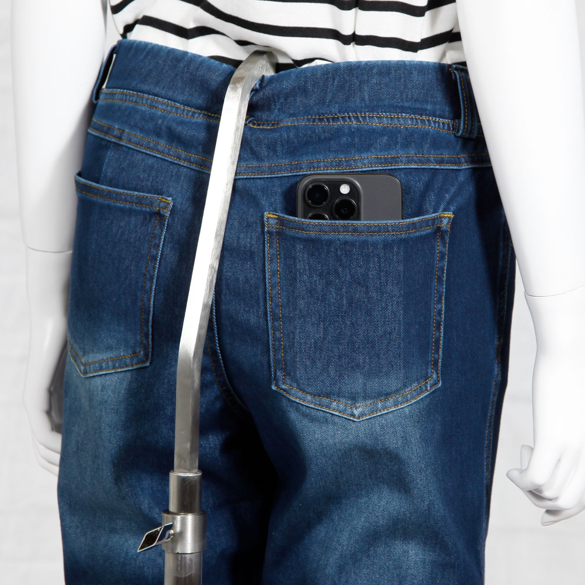 リベット付きのポケットやステッチ使いなど、本格的なデニム感を演出しています。