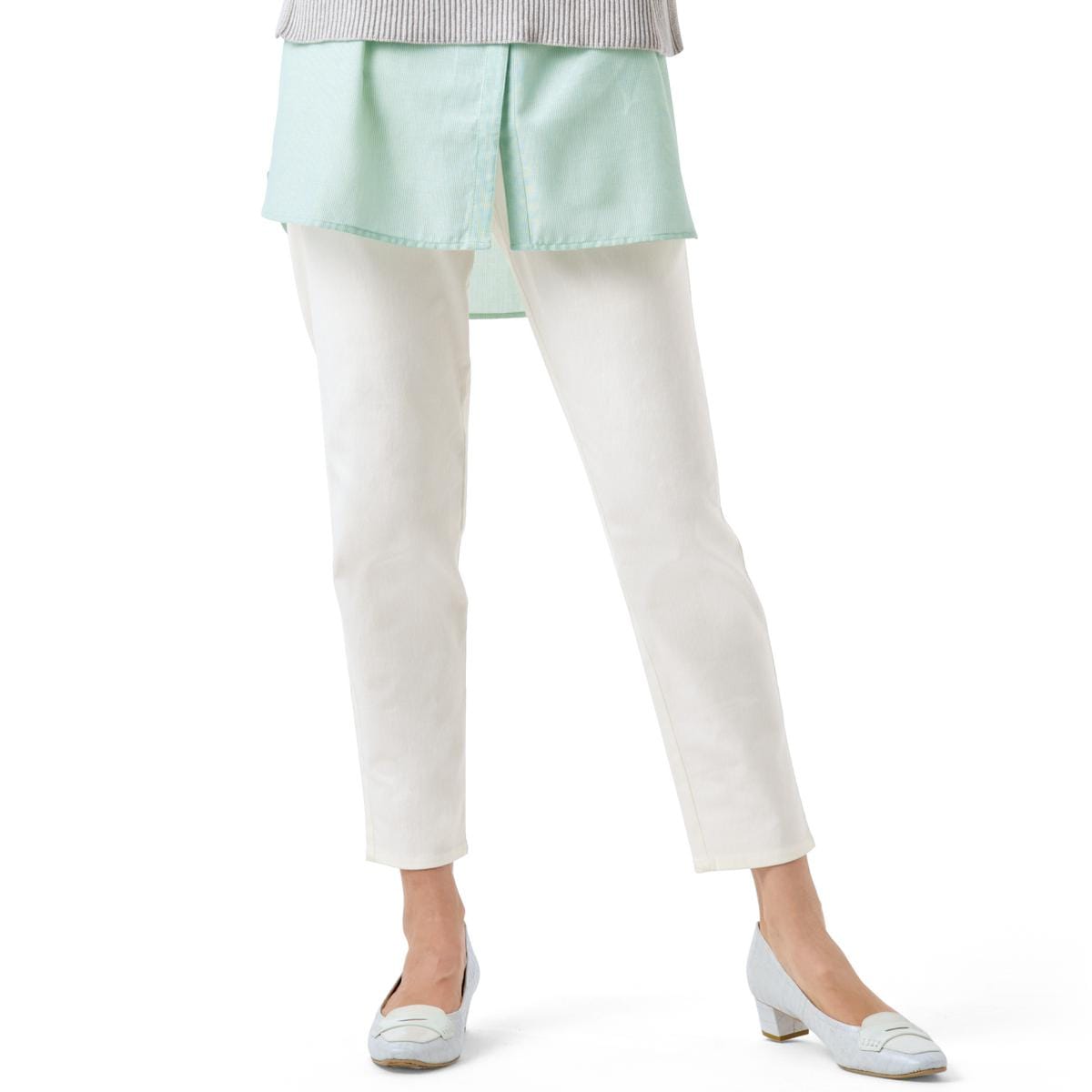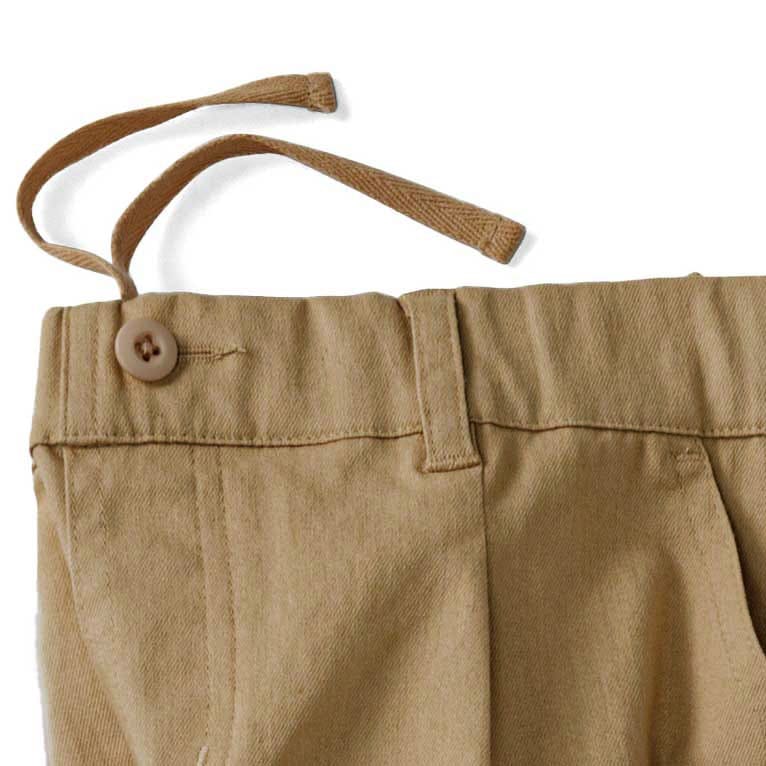 フロントタックで腰周りともも周りに余裕を持たせ、足元に向かってすっきり細くなるシルエット。