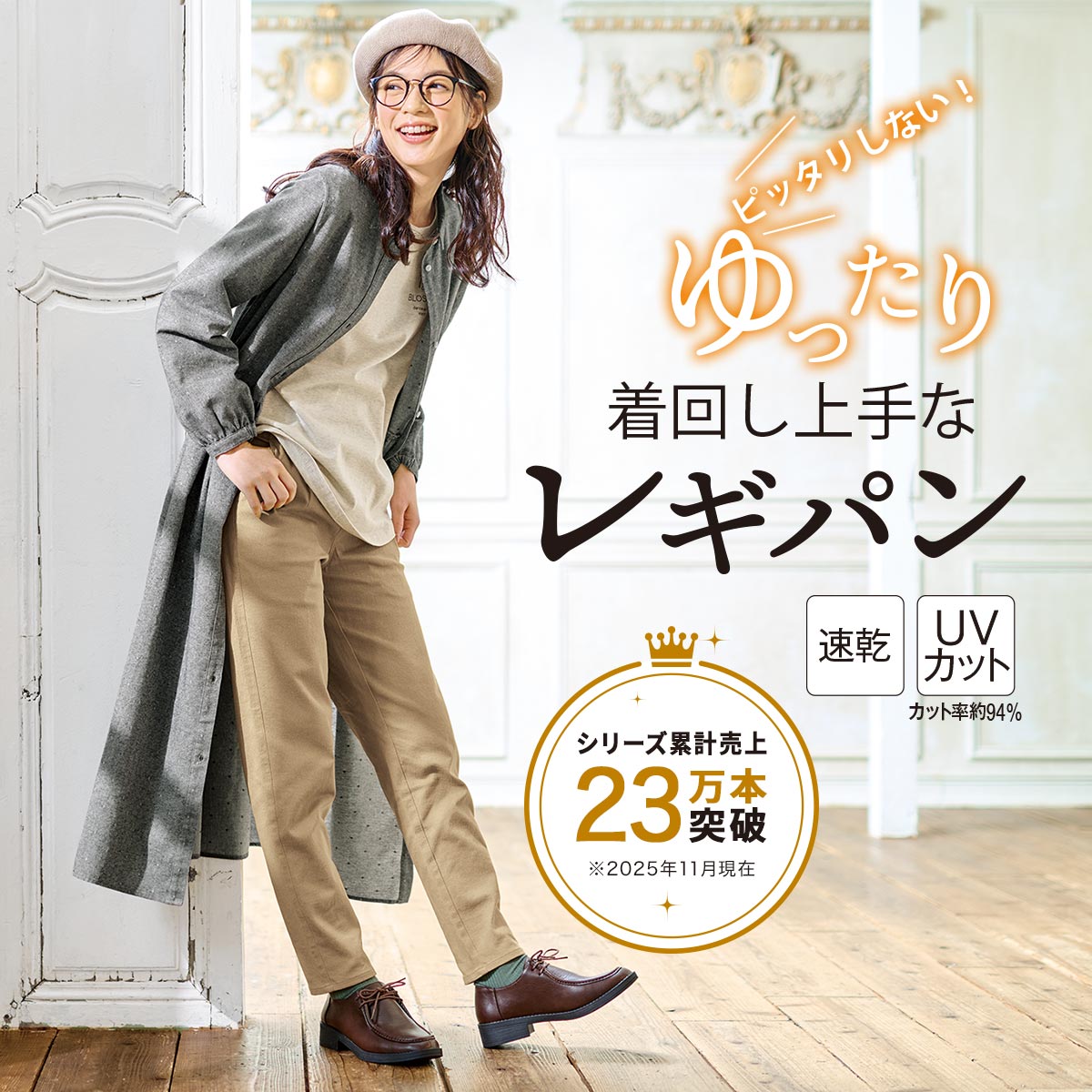 ◎人気商品!シリーズ累計販売20万本突破!(2025年1月現在)細見えが叶うテーパードシルエットのゆったりレギンス。ハリ感のある綿混ストレッチツイル素材を使用し、脚を曲げた時の窮屈感が気にならないので動きやすく、はき心地もラクラク♪