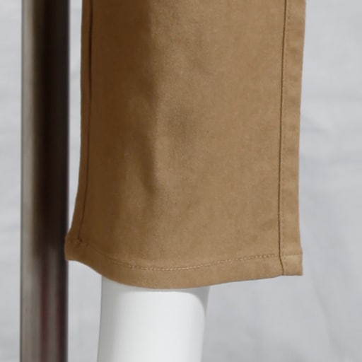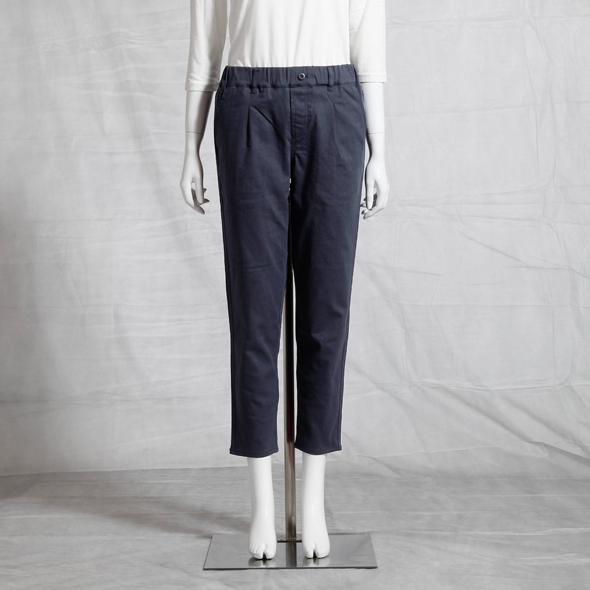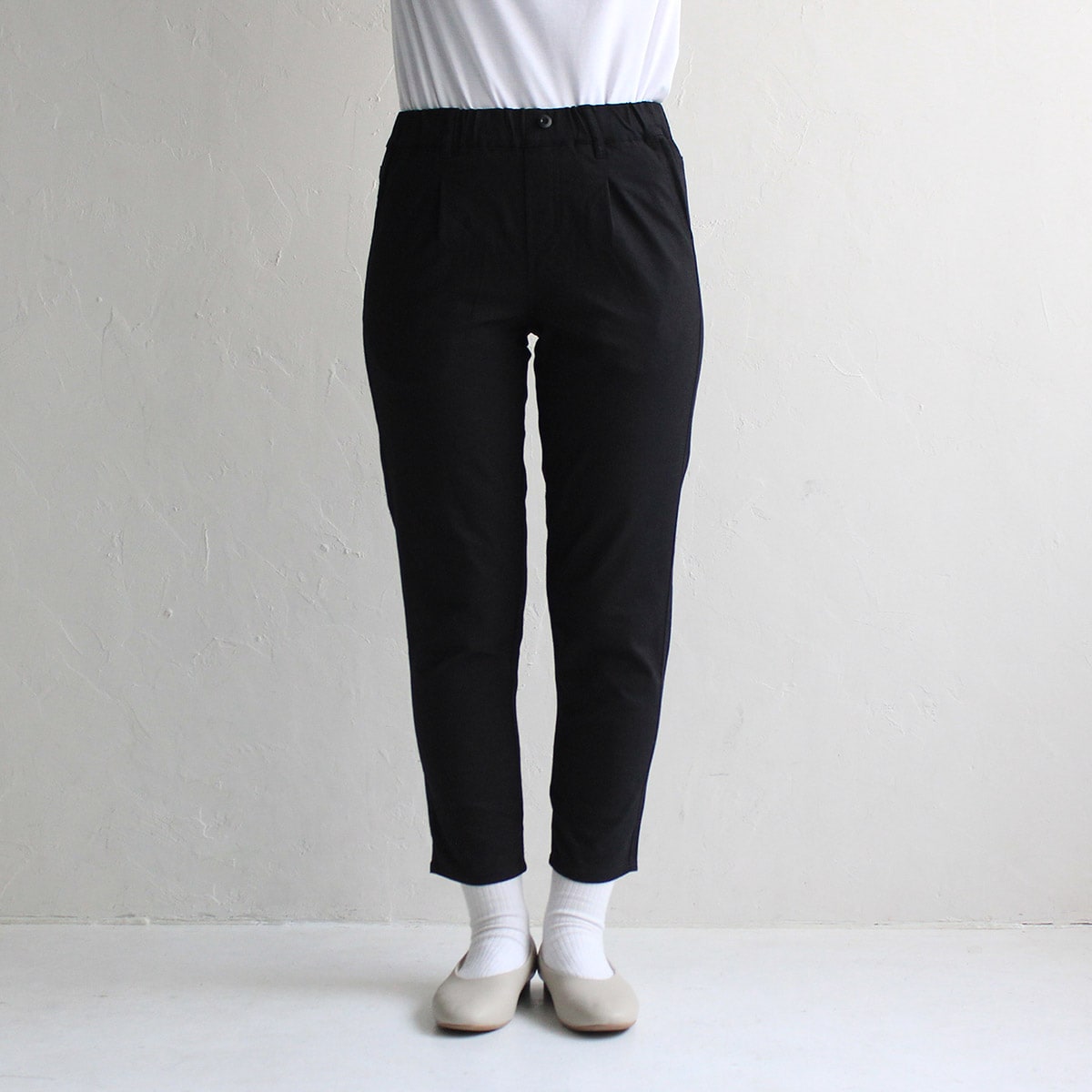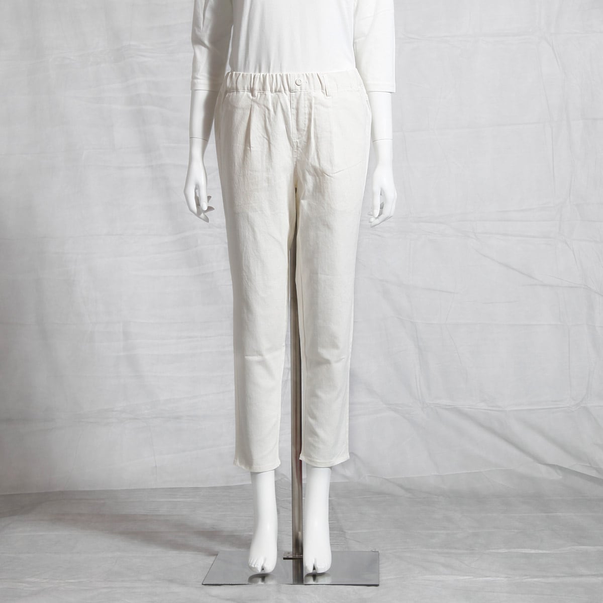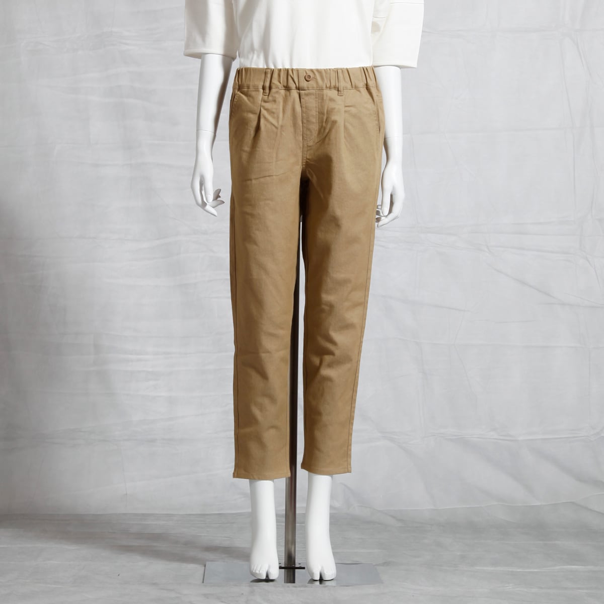 フロントタックで腰周りともも周りに余裕を持たせ、足元に向かってすっきり細くなるシルエット。