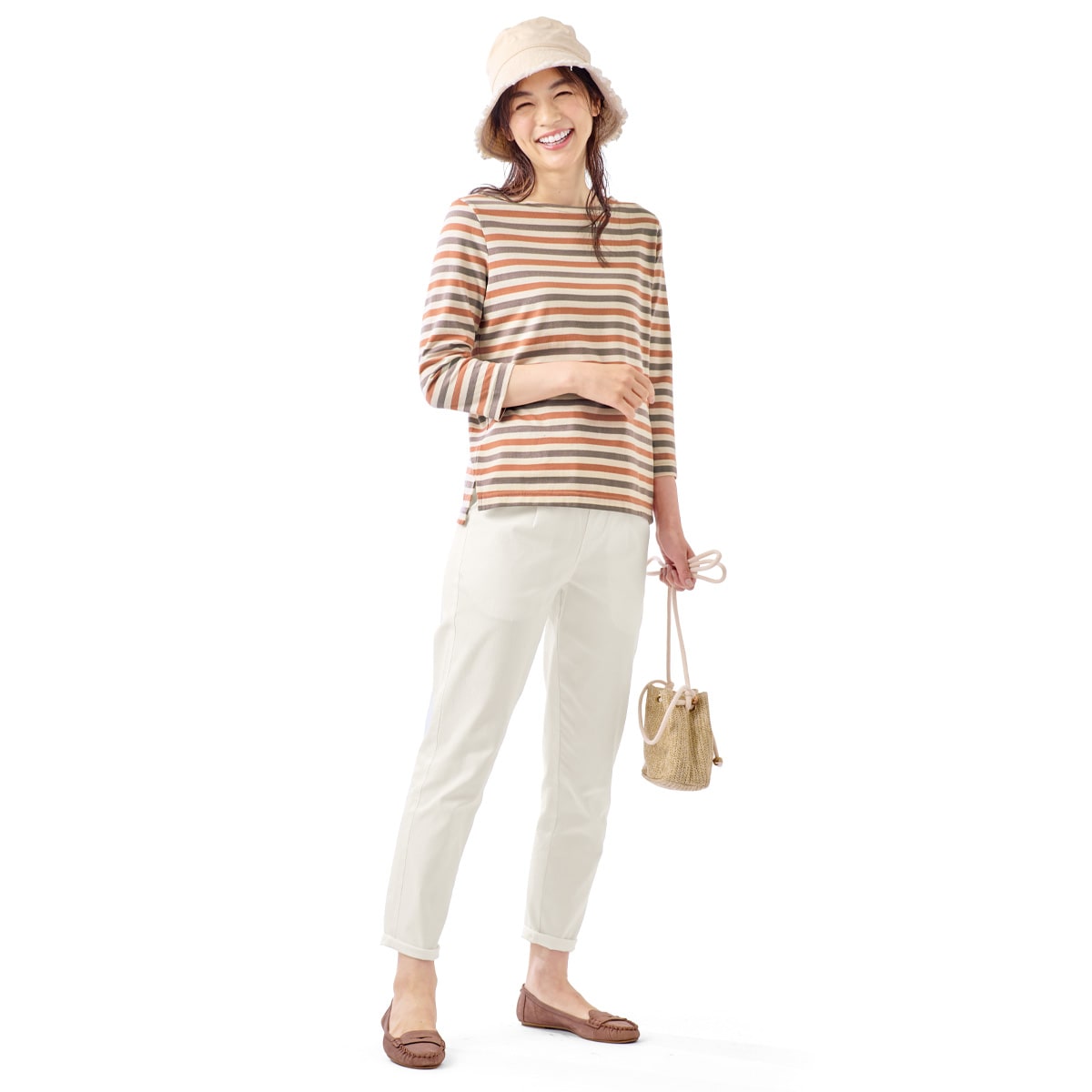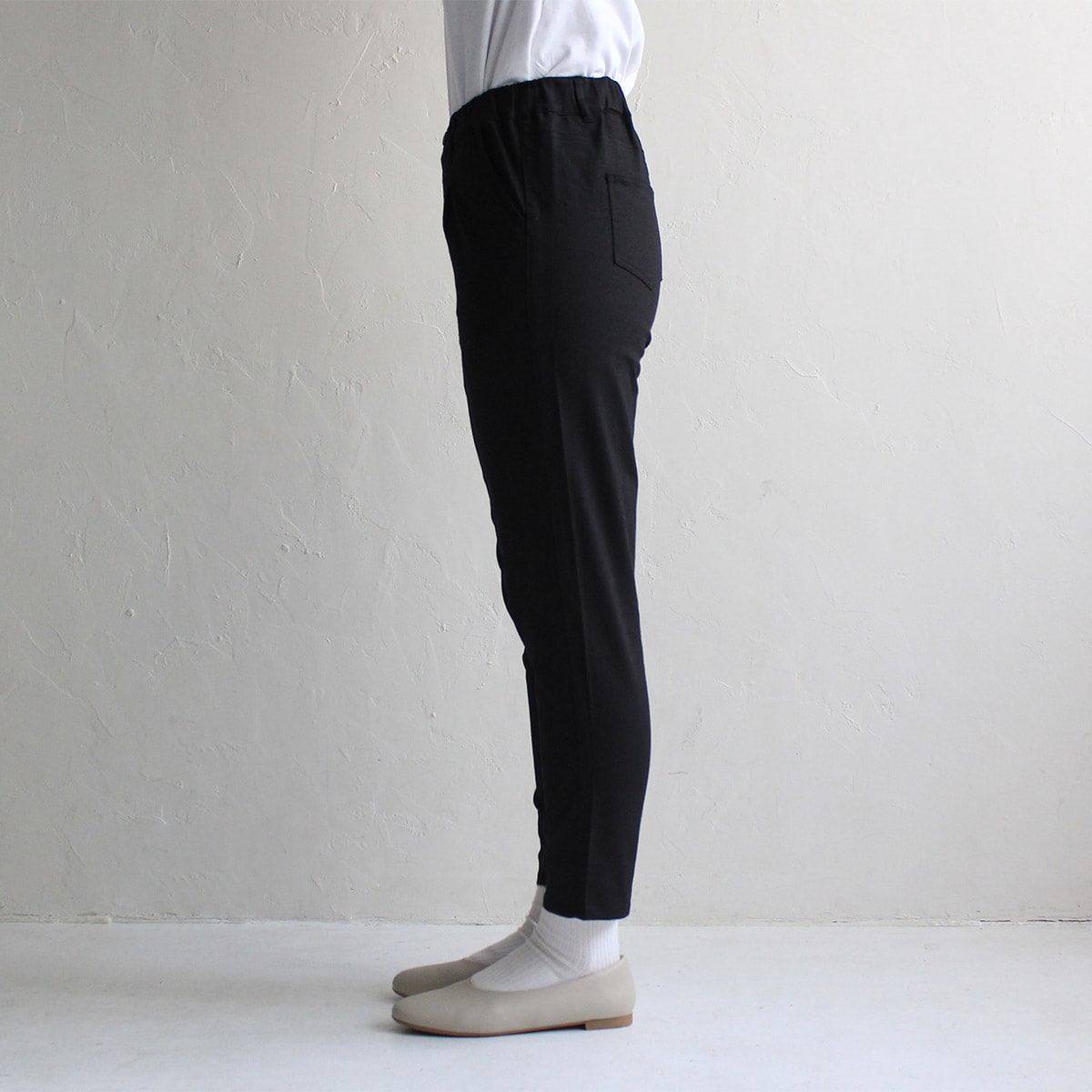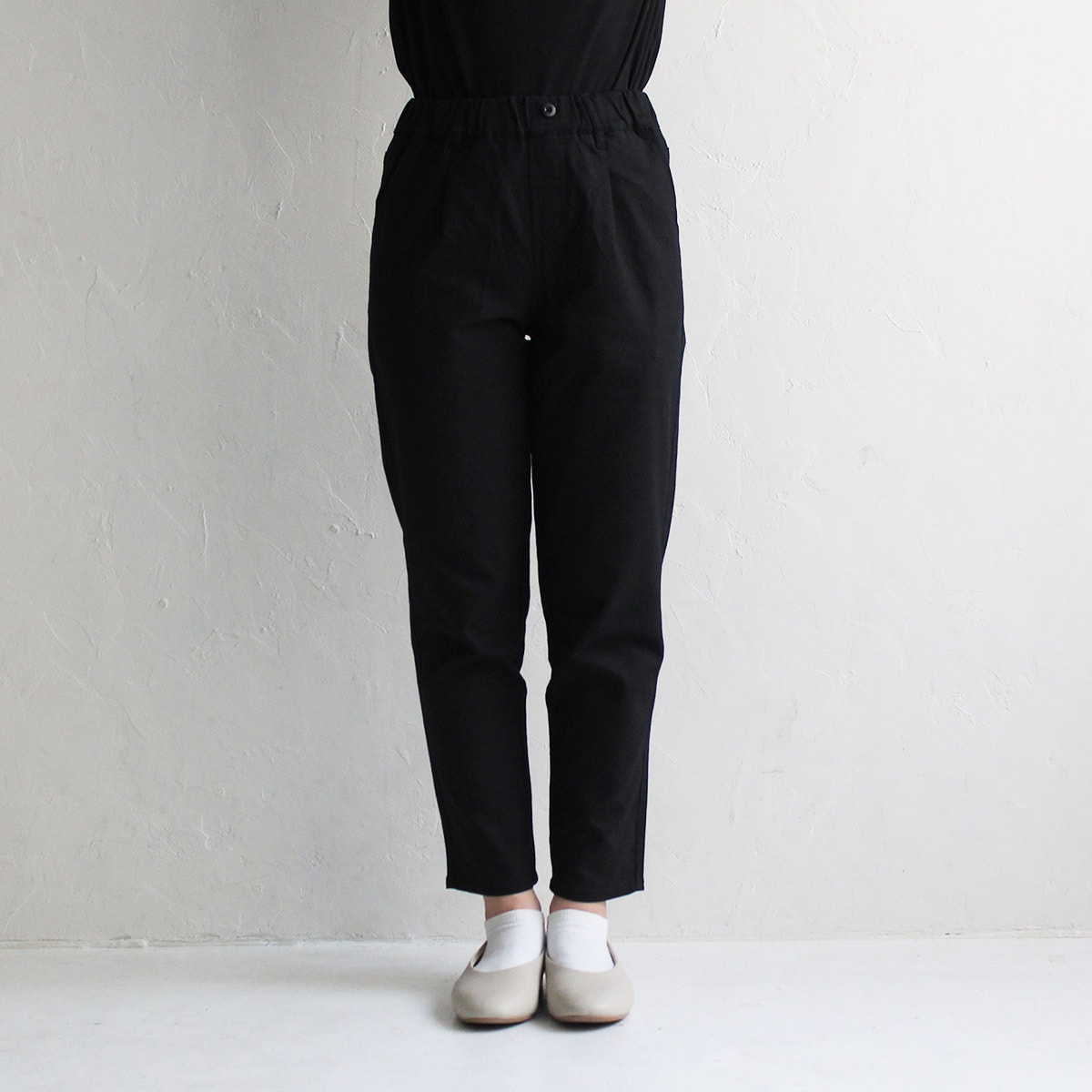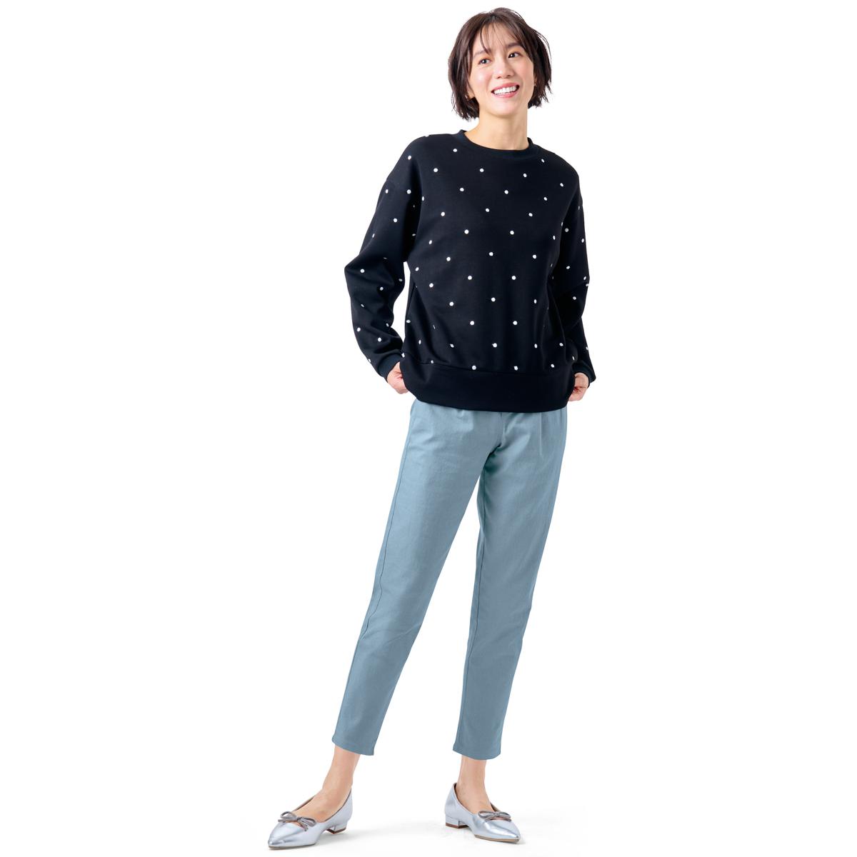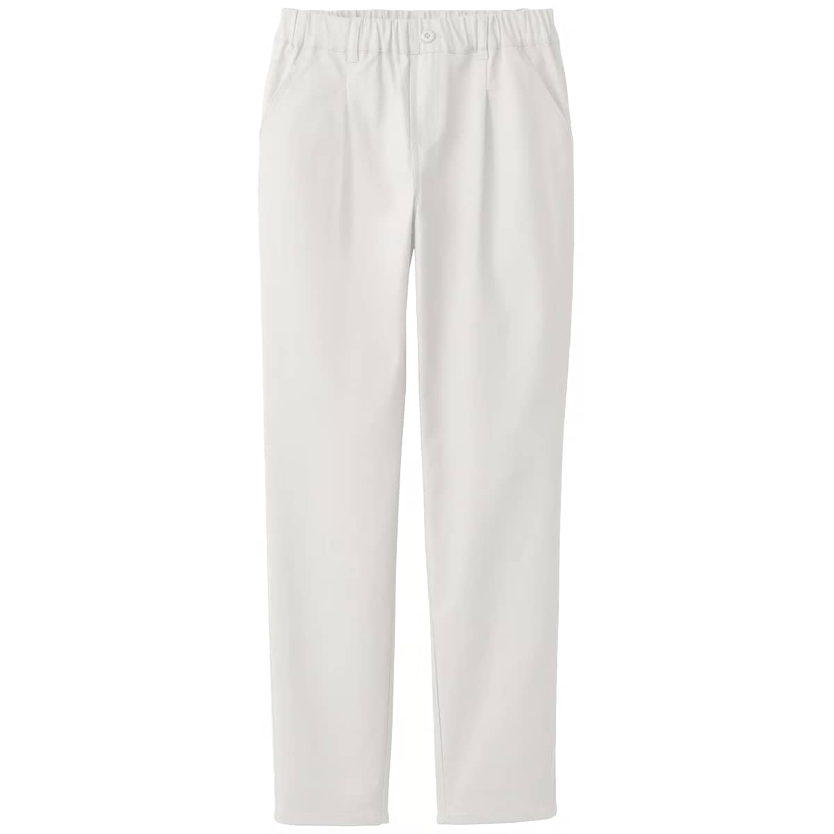 フロントタックで腰周りともも周りに余裕を持たせ、足元に向かってすっきり細くなるシルエット。