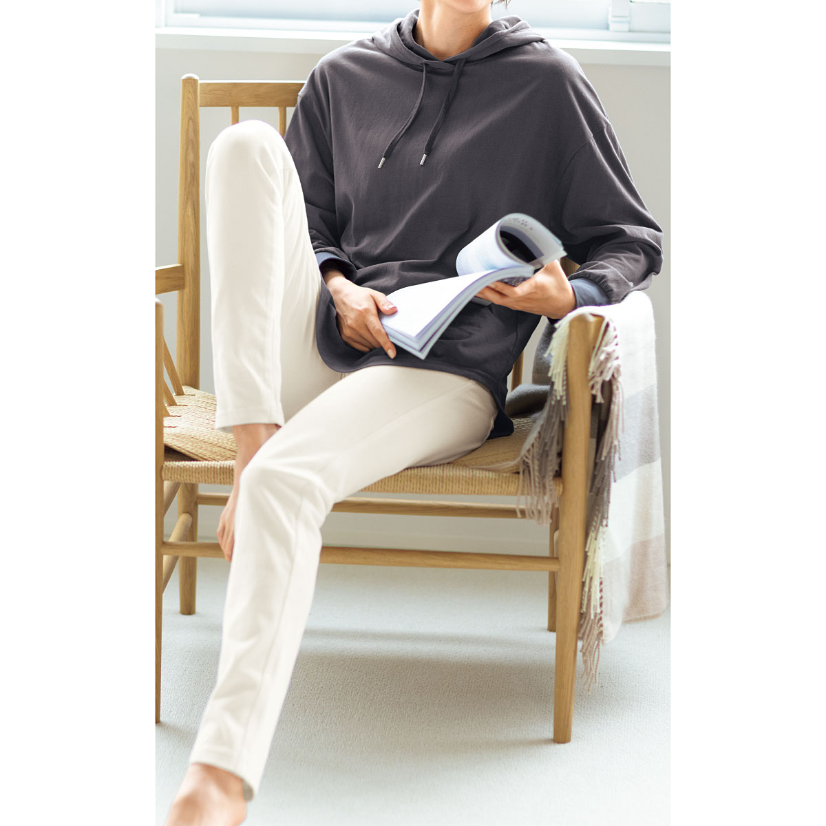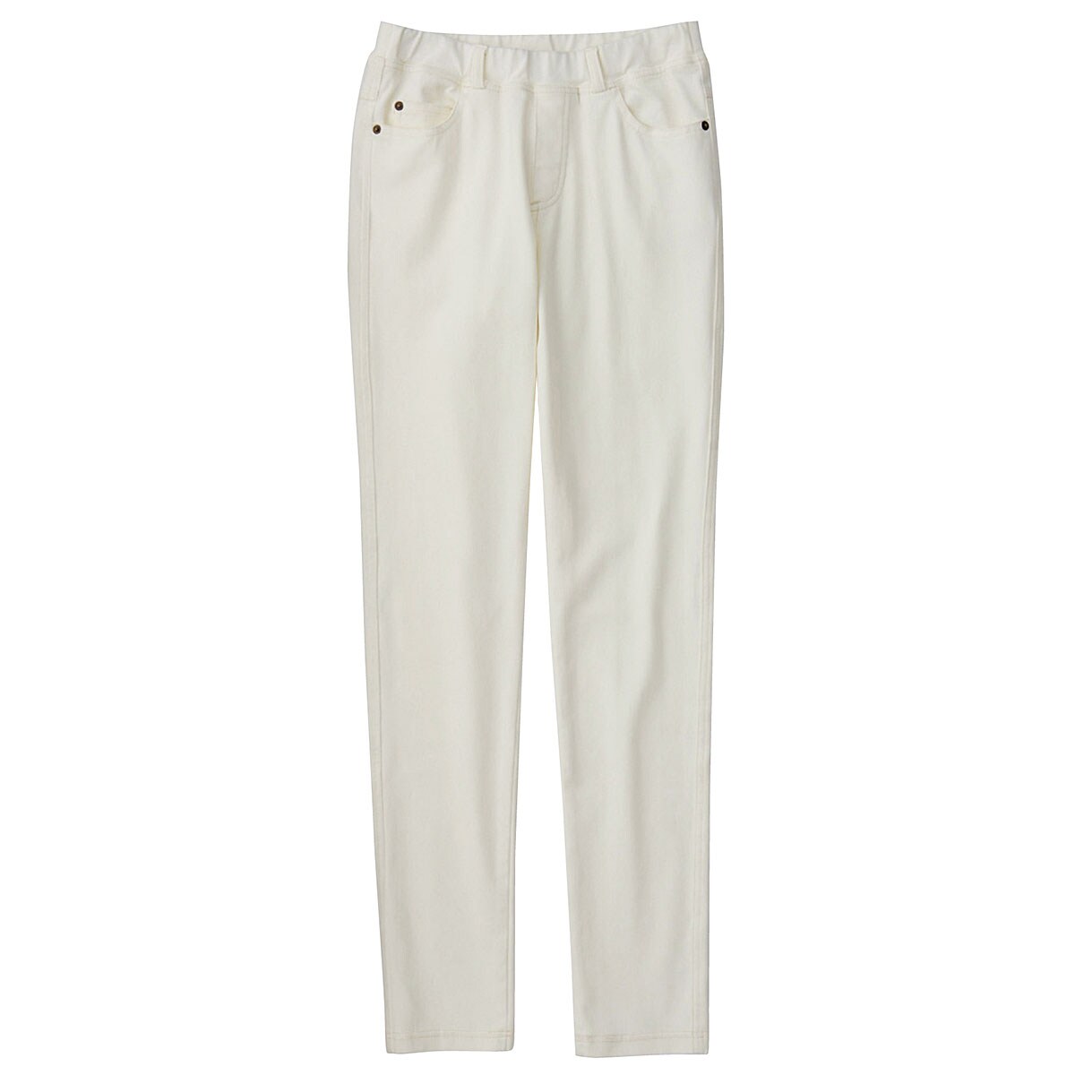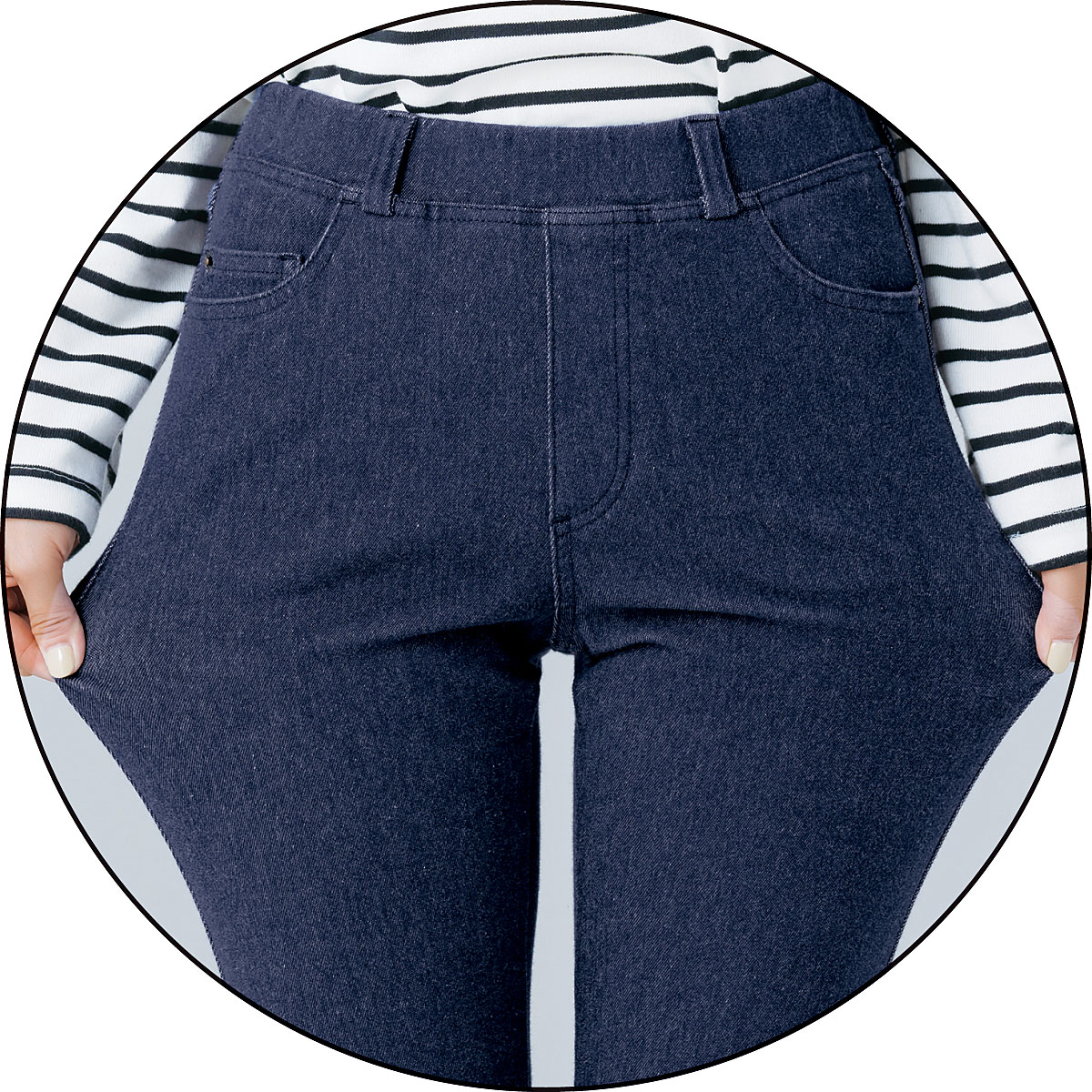 こだわりのディテールでスリムな見た目ながら、快適なはき心地の本格デニム見えスキニーパンツ。ストレッチニット素材なのでやわらかく、適度な厚みがあり脚のラインを拾いにくいので、気になる部分もすっきりカバーしてくれます。さらにウエスト総ゴム仕様なのでお腹まわりもラクラク!美脚見えにこだわりつつ動きやすさも兼ね備えた、着まわしがきく便利なアイテムです