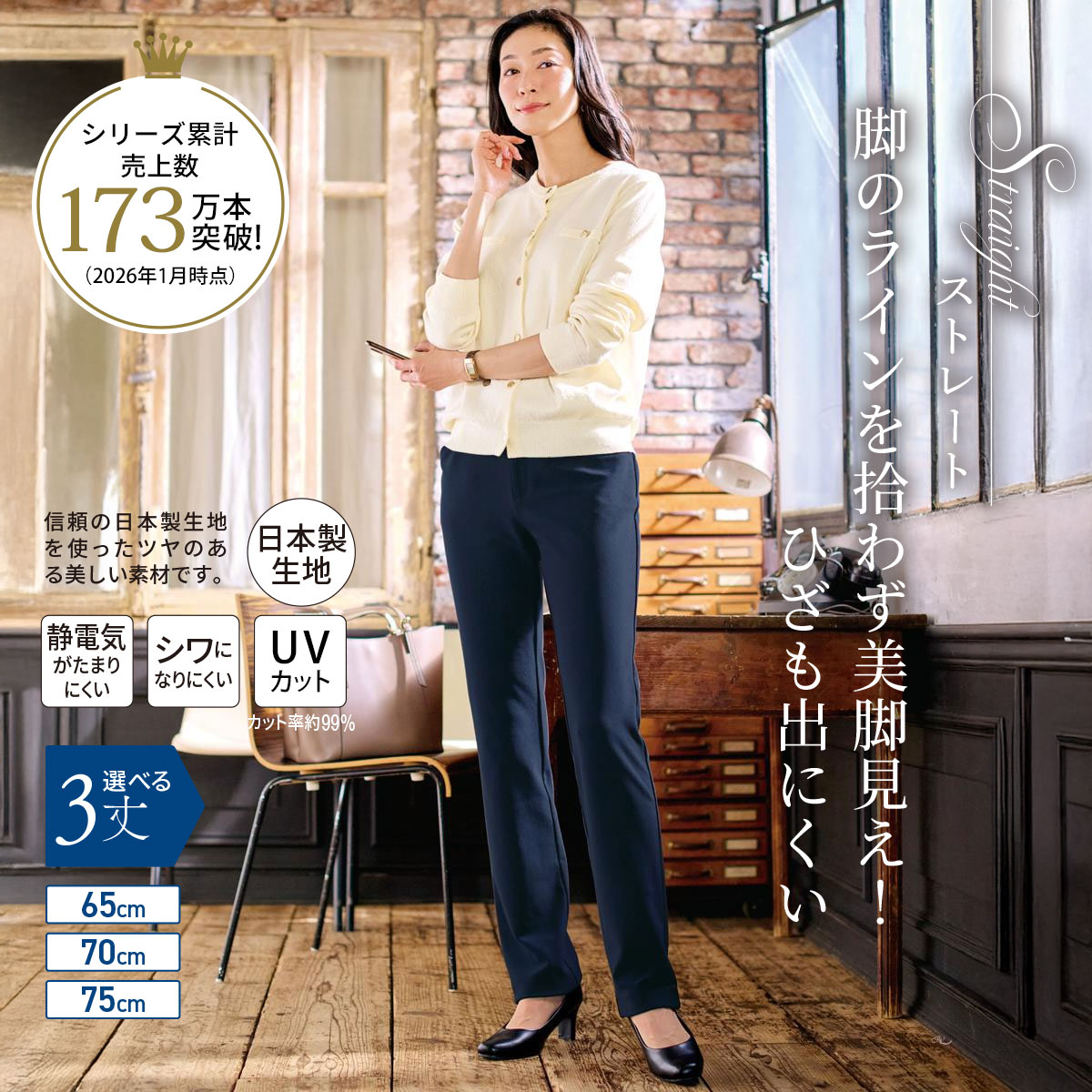 -お買得ポイント-微光沢とツヤ感のある日本製の生地使用!全方向ストレッチでらくちん&前開きの本格仕様できちんと見えも叶います。-デザイン-定番のストレートパンツはすっきりとしたシルエットでコーディネートしやすいのもポイント。脚をすらっと見せてくれる美脚効果も期待できます。伸縮性があるから、ひざも出にくい。-素材特徴-タテ・ヨコ・ナナメの全方向ストレッチでよく伸びるニット素材は、柔らかいはき心地で窮屈感なし!シワにもなりにくいのでデイリーに活躍します。