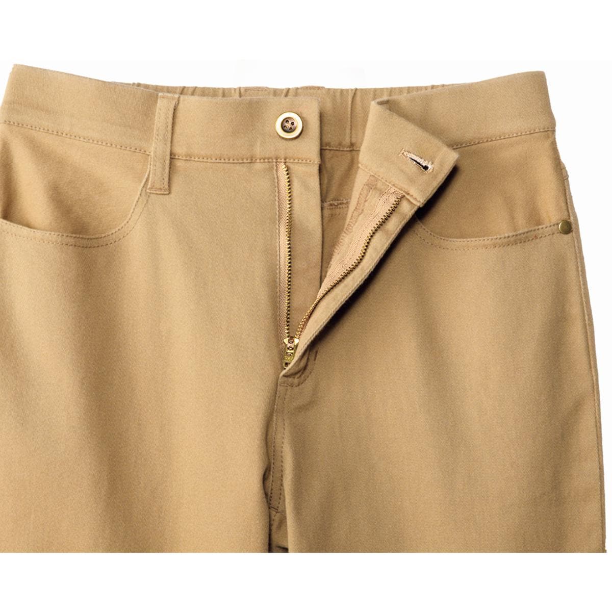 -お買い得ポイント-ピタッとし過ぎず、動きやすく脚をほっそり見せるスキニーシルエット。-デザイン-ウエストは総ゴムで楽ちんなのに、前はフラット、後ろのギャザーも極力抑えてすっきり見えにこだわっています。後ろのポケットを「ハの字」に配置することでヒップアップ見せも叶う!ヨコストレッチが効いているので動きやすくファスナーあきなので着脱も楽ちん。-素材特徴-やや厚手で丈夫な綿混ツイル素材に、乾燥機を使っても縮みにくいタンブルドライ加工を施しました。