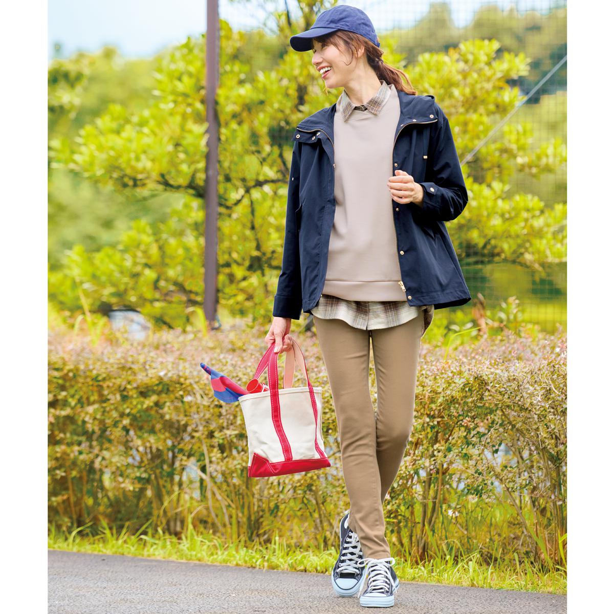 -お買い得ポイント-ピタッとし過ぎず、動きやすく脚をほっそり見せるスキニーシルエット。-デザイン-ウエストは総ゴムで楽ちんなのに、前はフラット、後ろのギャザーも極力抑えてすっきり見えにこだわっています。後ろのポケットを「ハの字」に配置することでヒップアップ見せも叶う!ヨコストレッチが効いているので動きやすくファスナーあきなので着脱も楽ちん。-素材特徴-やや厚手で丈夫な綿混ツイル素材に、乾燥機を使っても縮みにくいタンブルドライ加工を施しました。