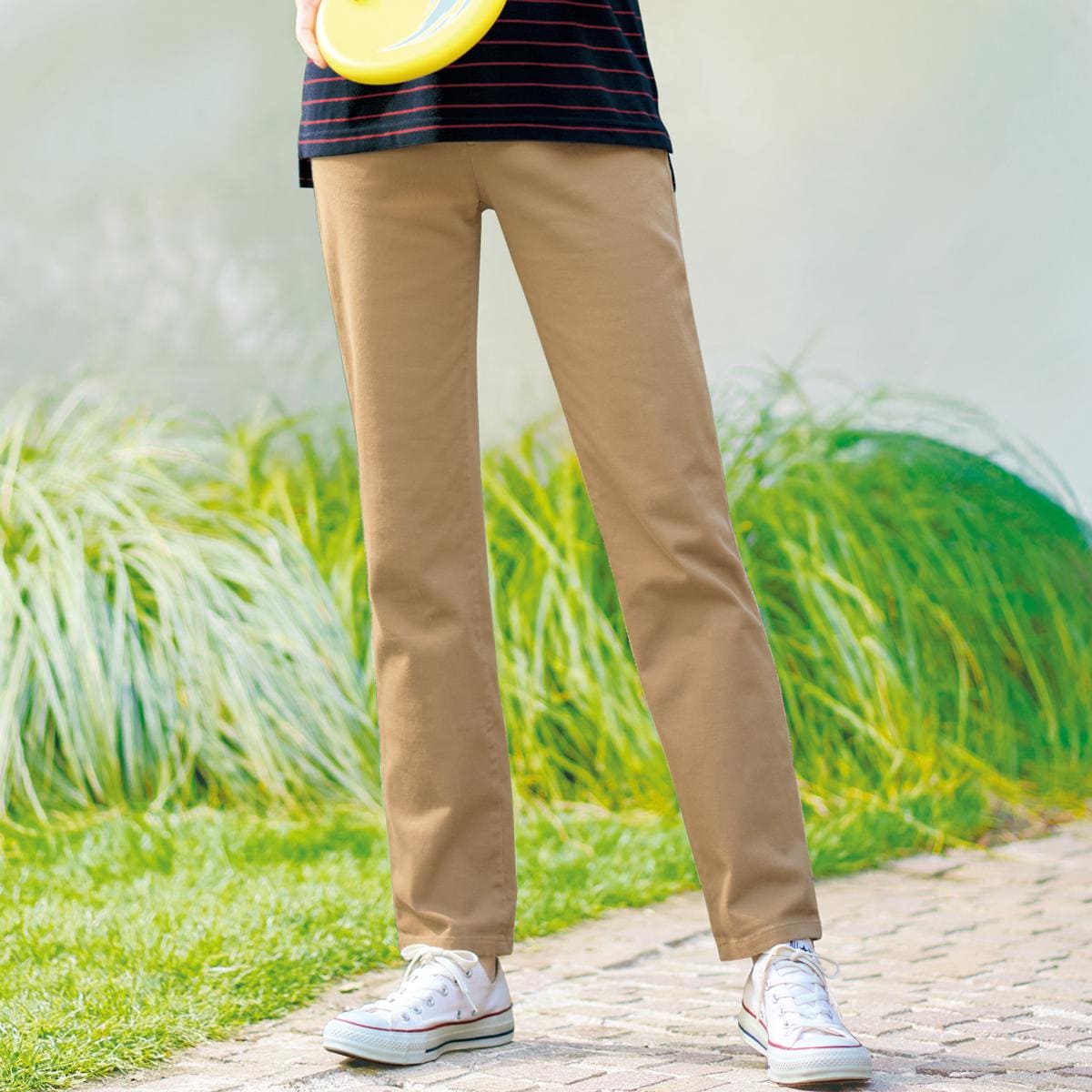 -お買得ポイント-洗濯に強い丈夫な生地だから洗濯機・乾燥機OK!毎日洗って毎日はけて、お手入れもラクチンです。フロントは総ゴム仕様に見えないフラットデザインではき心地も快適!-デザイン-脚が長くきれいに見える定番シルエットで着まわしやすい!フロントファスナー開きにベルトループ付きで本格見えするデザインだから、シーンを選ばずはけます。-素材特徴-やや厚手の綿混ツイルで、乾燥機でも縮みにくい素材を使用。毎日洗えて便利◎よく伸びるヨコストレッチ素材でヒザやお尻が突っ張らず快適!