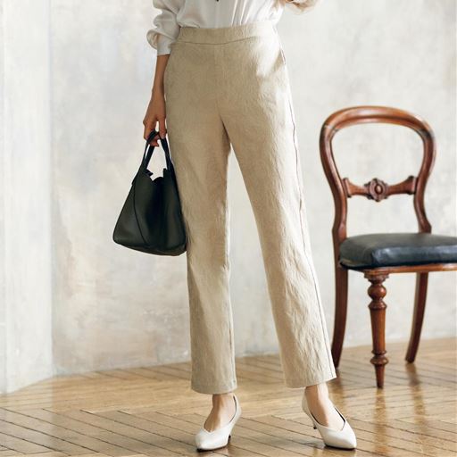 ―お買い得ポイント―高い技術を誇る日本の工場で縫製しました。繊細な織物を活かし引き立てる、職人の丁寧な熟練の技術が光ります。―デザイン―すっきりシルエットで脚のラインをきれいに見せてくれるストレートパンツです。横ストレッチが効いていて、ウエストは総ゴム仕様で楽におしゃれが叶います。―素材特徴―ジャカード素材で高級感とハリが魅力的!色の濃淡と生地の凹凸で表情豊かな素材です。
