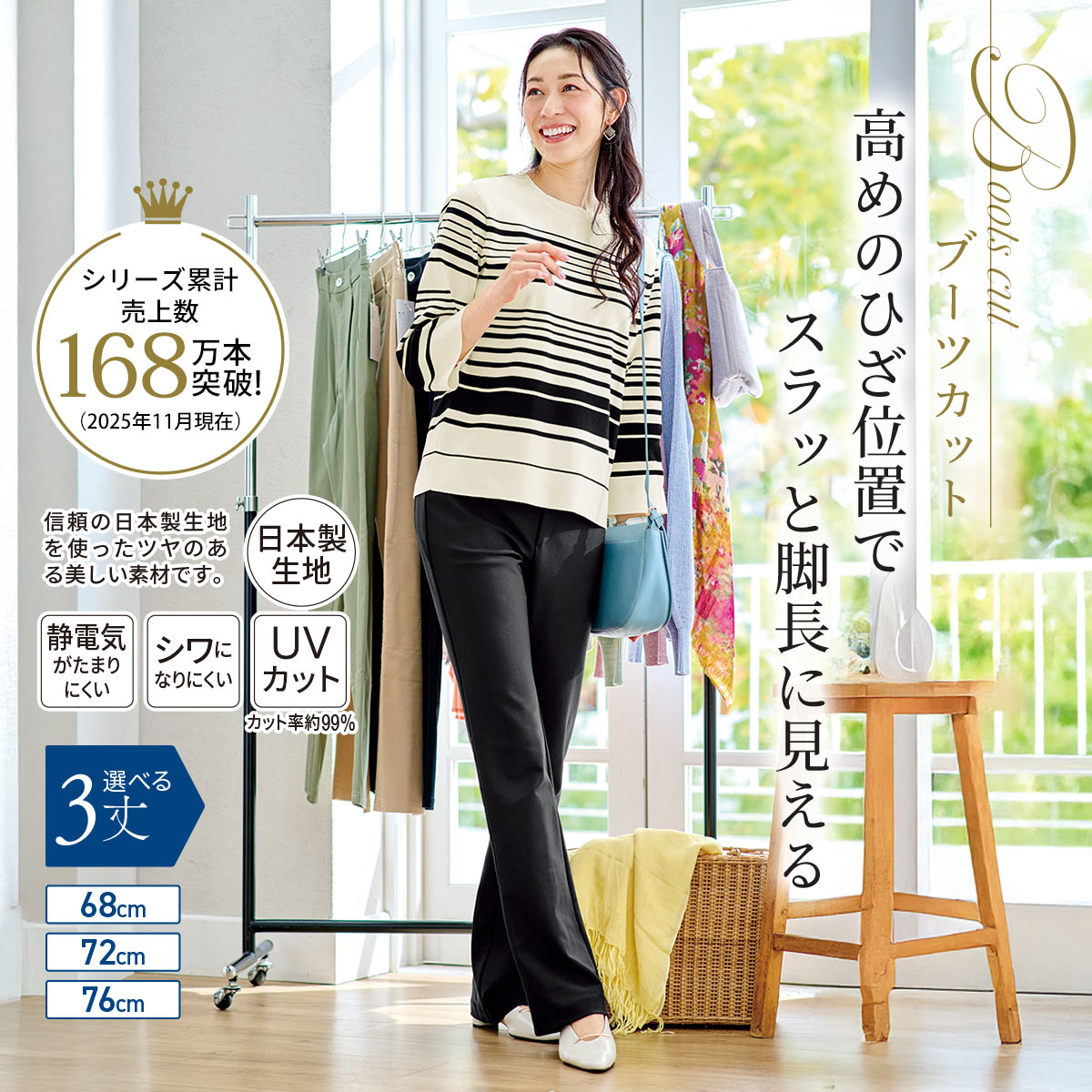 -お買得ポイント-微光沢とツヤ感のある日本製の生地使用!全方向ストレッチでらくちん&前開きの本格仕様できちんと見えも叶います。-デザイン-ひざ位置を高めにすることで脚長見え!上品なフレア感のブーツカットタイプは、メリハリ感があって脚をすらっと見せてくれる美脚効果も期待できます。伸縮性があるから、ひざも出にくい。-素材特徴-タテ・ヨコ・ナナメの全方向ストレッチでよく伸びるニット素材は、柔らかいはき心地で窮屈感なし!シワにもなりにくいのでデイリーに活躍します。