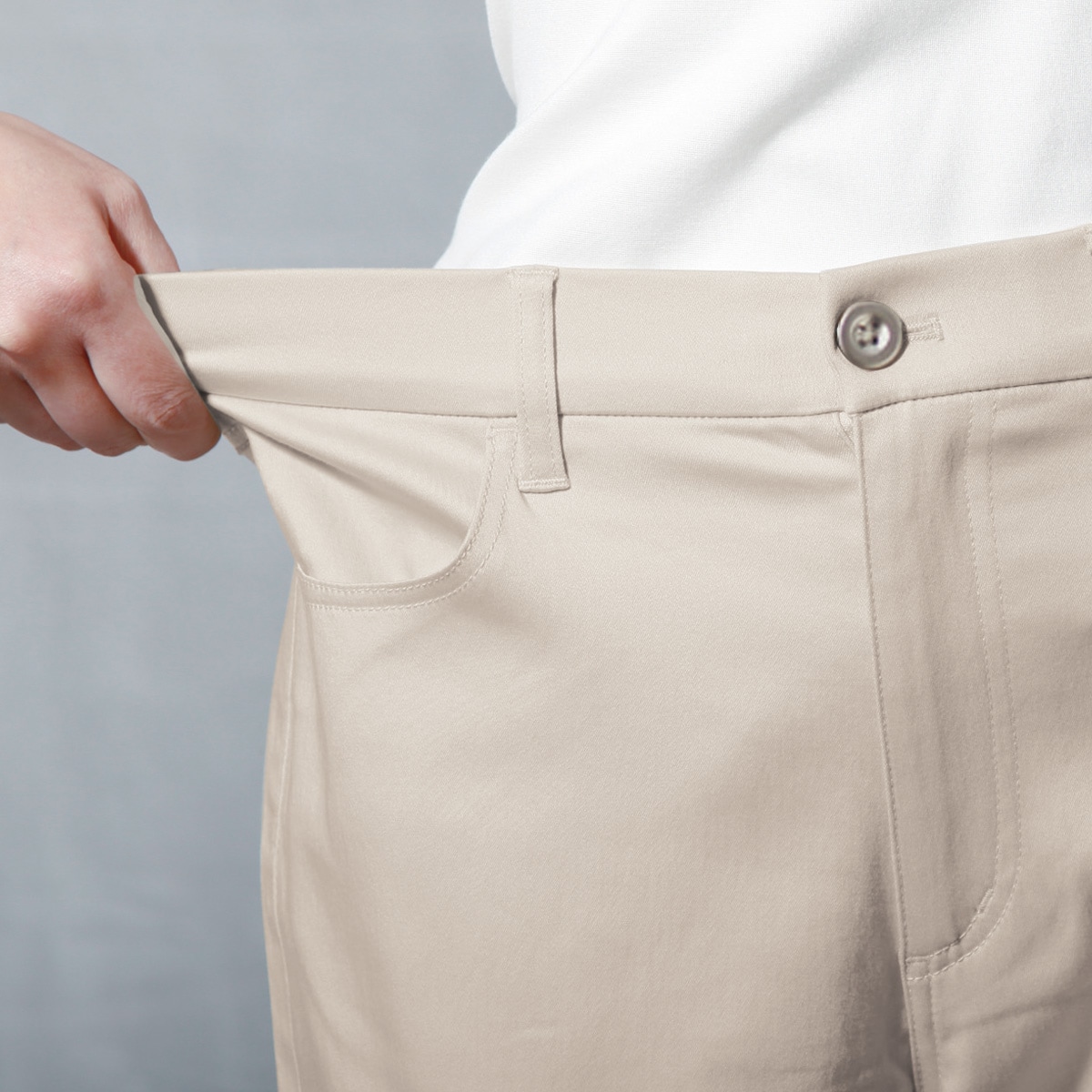 表面に微光沢感があり、きれいめな印象を叶える綿混素材のストレッチ生地を使用