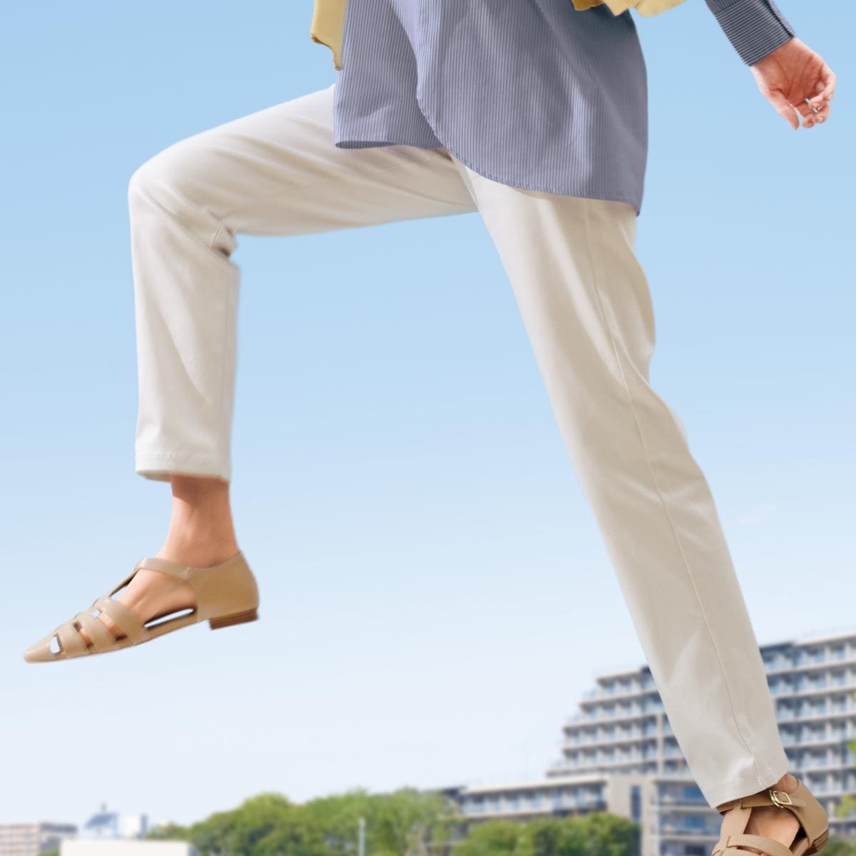 上品な微光沢で美シルエットが映える!肌ざわりがサラリ爽やかな綿混サテンストレッチパンツ。程よくゆとりがあり、大人に似合うシルエットです。