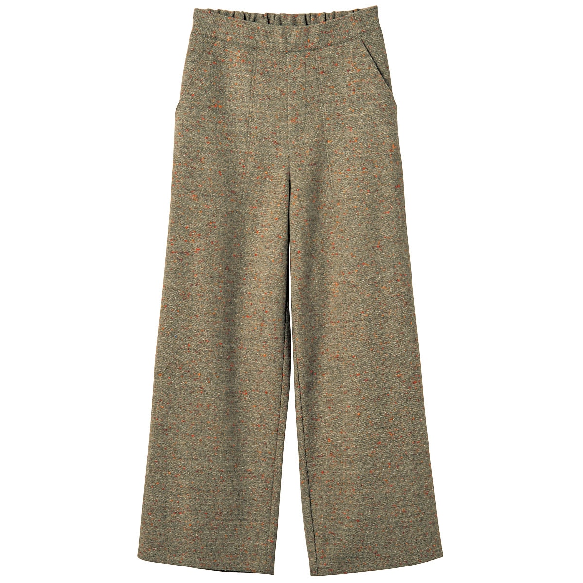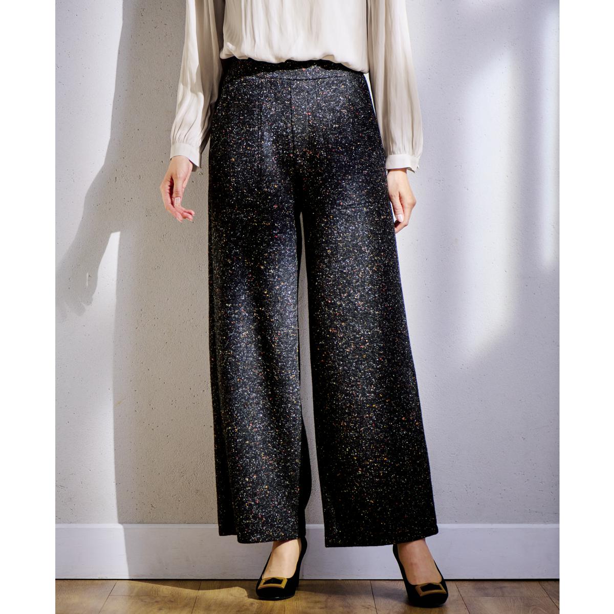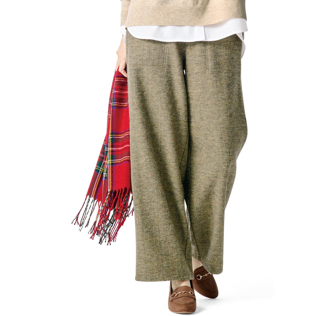 -お買い得ポイント-冬映えする上質感のあるツイード調。ネップが表情豊かなアクセントとなり、上品なカジュアル感を演出できる点が魅力です。-デザイン-広がりを抑えたワイドシルエットが上品な印象を醸し出しています。ウエストは総ゴム仕様なので、ラクに着こなせます。-素材特徴-暖かみのあるカラーネップツイード調カットソー。ストレッチ性があって動きやすく、長時間座っていてもしわが気になりにくいのもうれしいポイント。