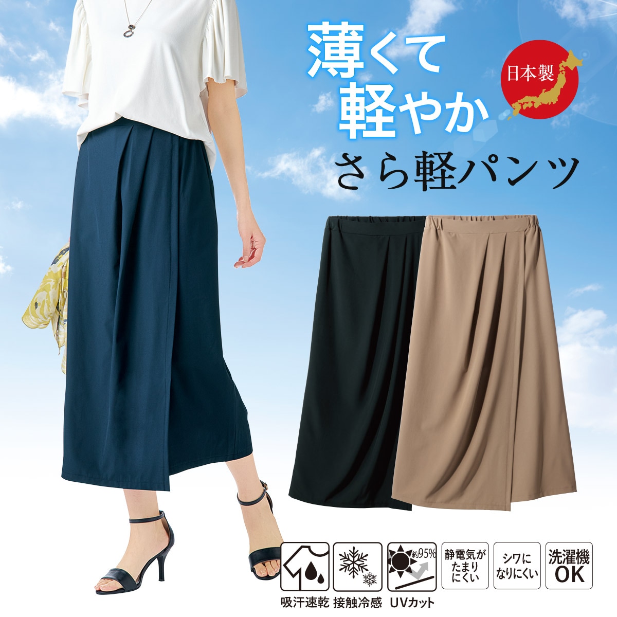 さら軽ストレッチラップ風キュロットパンツ(日本製・UVカット・接触冷感・吸汗速乾・シワになりにくい・節電対策)