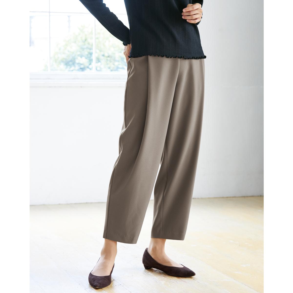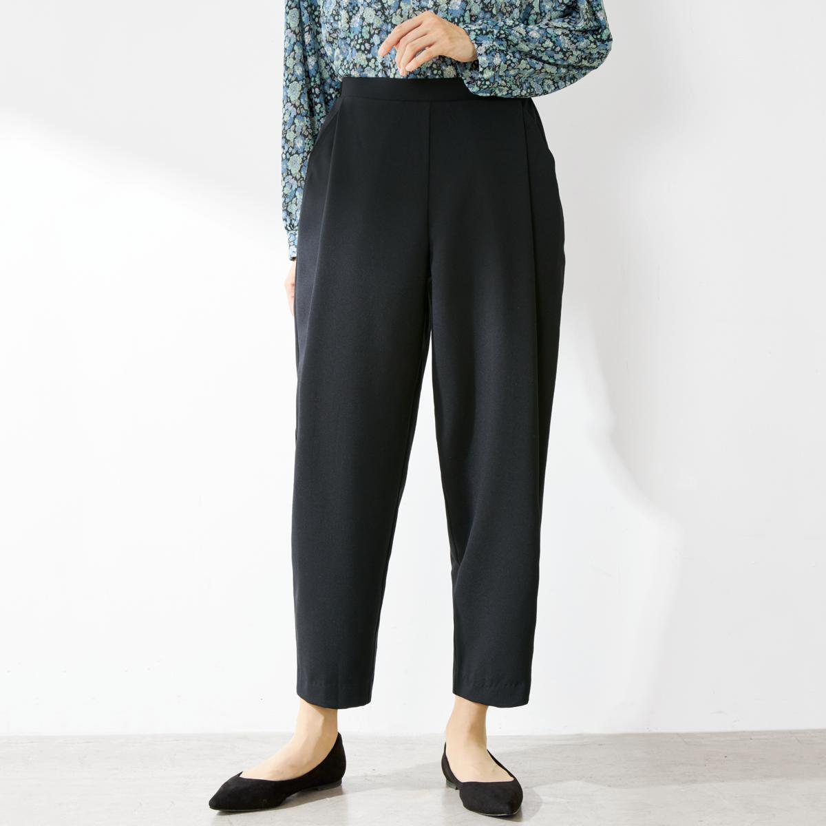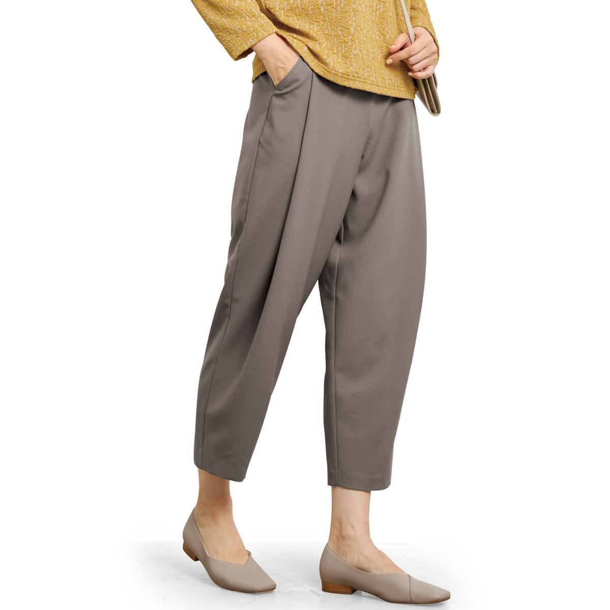 ウエストもラクすっきり!両サイドに寄せた大きめのタックで着心地ラク。ストンと落ちるンルエットでお腹まわりをすっきり見せます