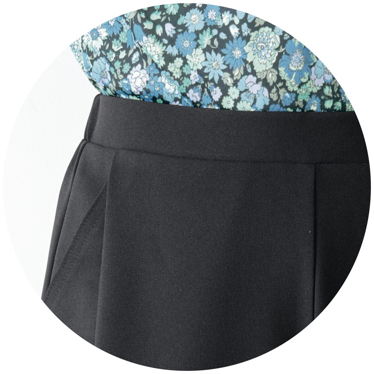 両サイドに寄せた大きめのタックで着心地ラク。ストンと落ちるンルエットでお腹まわりをすっきり見せます。