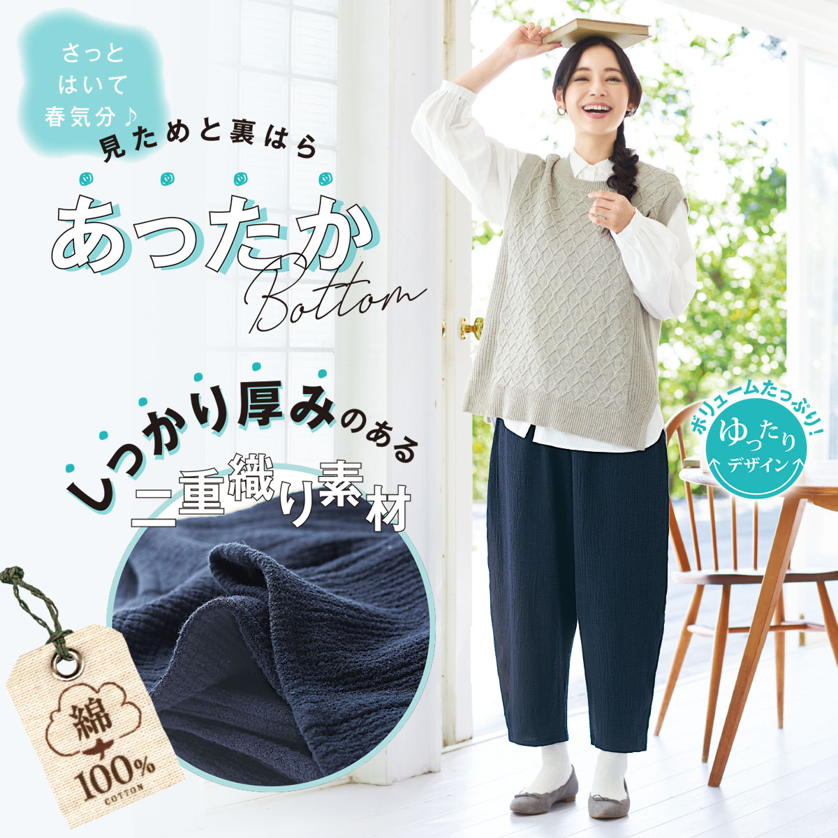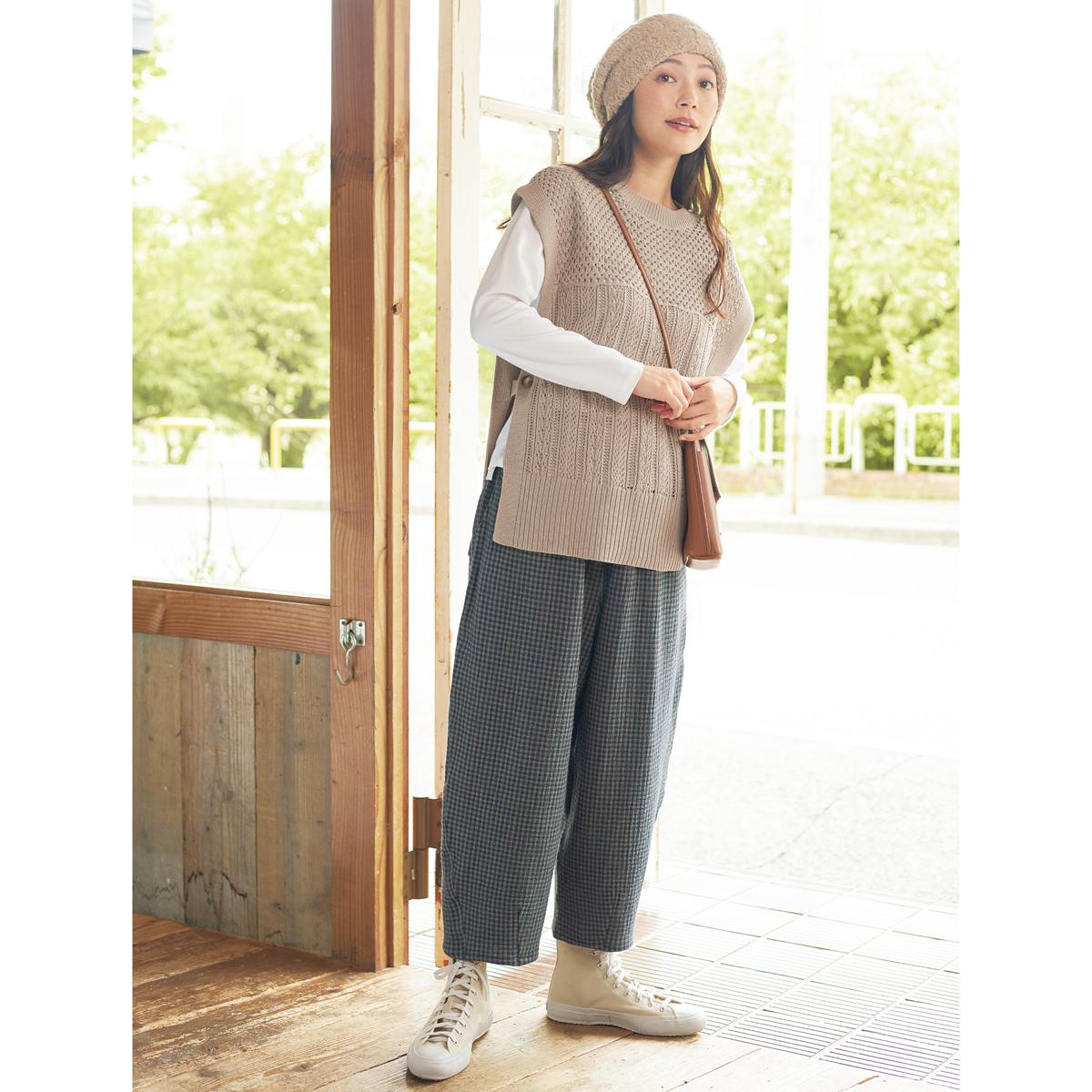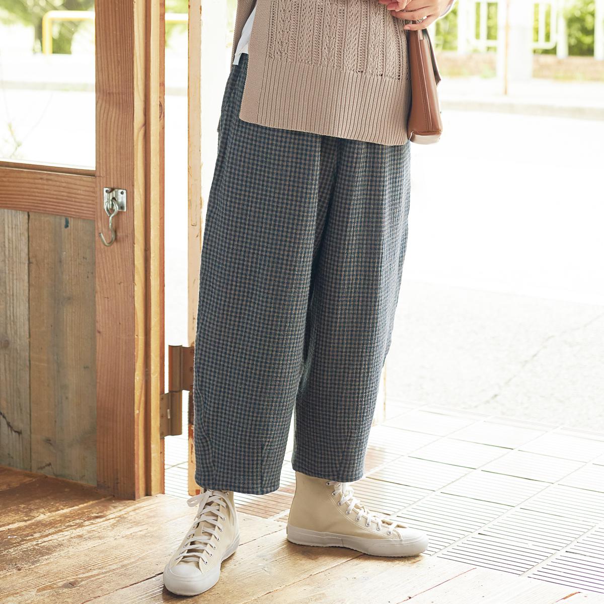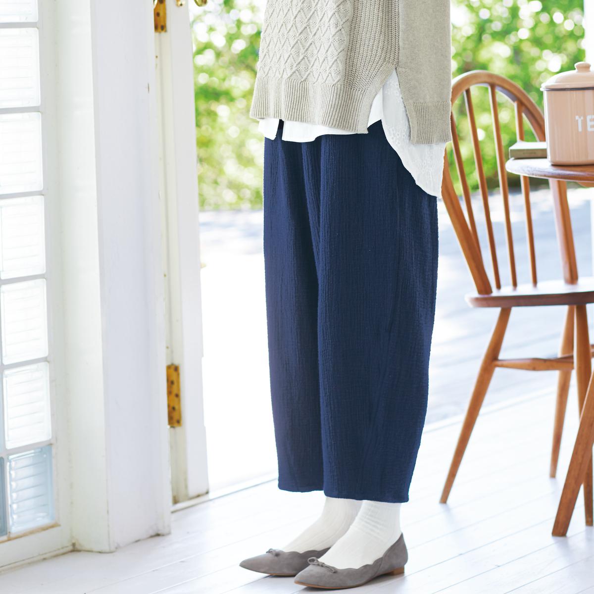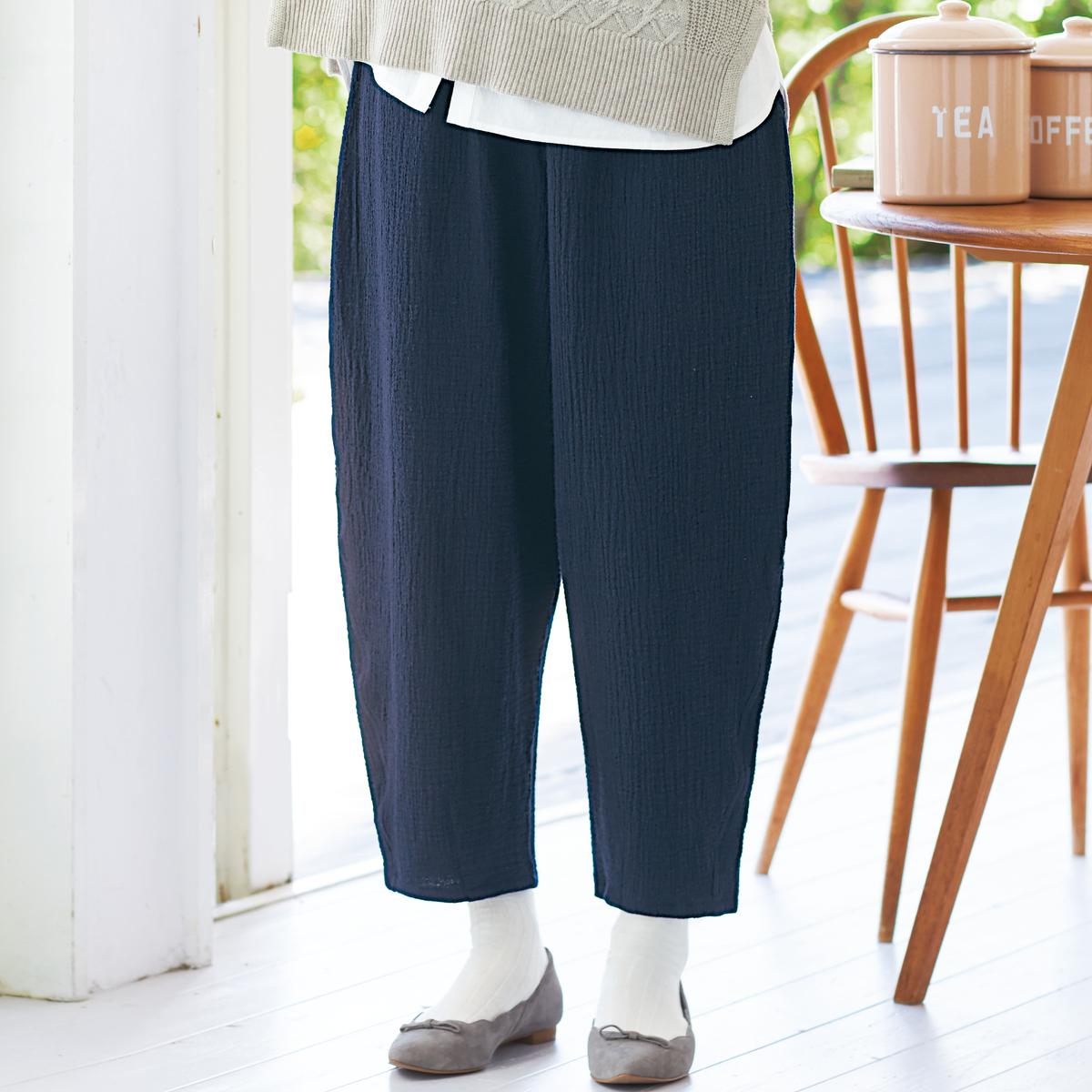 -お買い得ポイント-肌寒い日も重ねばきできるゆったりシルエットです。空気を含んだ二重織りが、暖かさをキープ。-デザイン-ウエストは総ゴム仕様でらくらく。ウエストのゴムは取替ができるので、長く履いていただけます。-素材特徴-しっかり厚みのある二重織り素材。表面のポコポコとした素材感もオシャレな雰囲気に。
