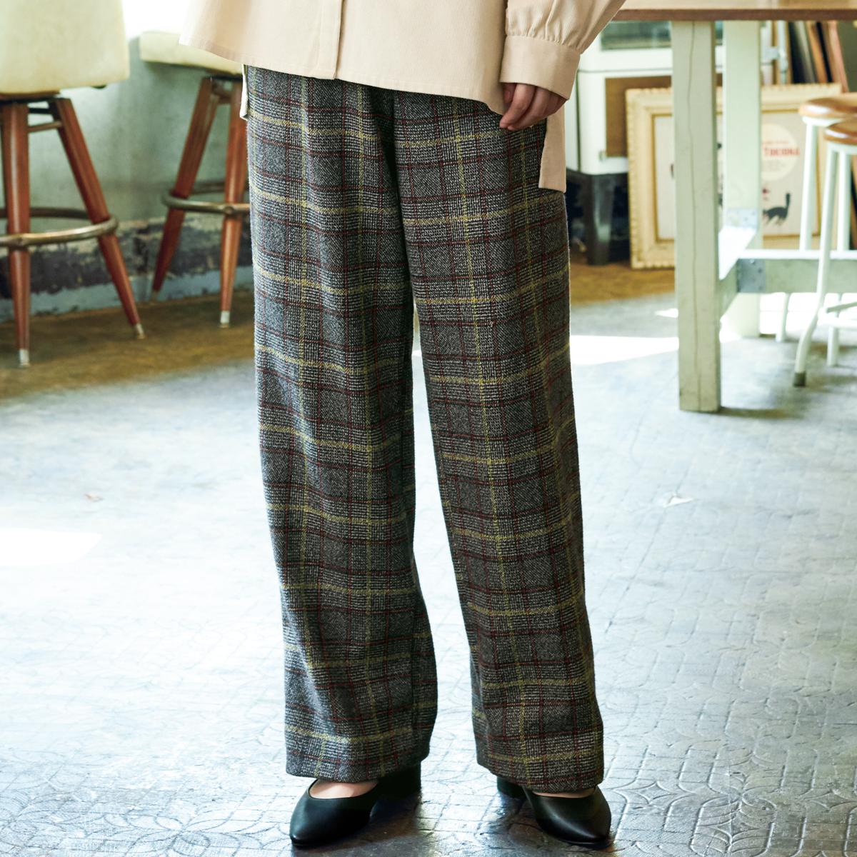 前タックでお腹まわりもゆったり&幅広のストレートシルエットがラクなはき心地。ざっくりした織りの風合いが魅力です。