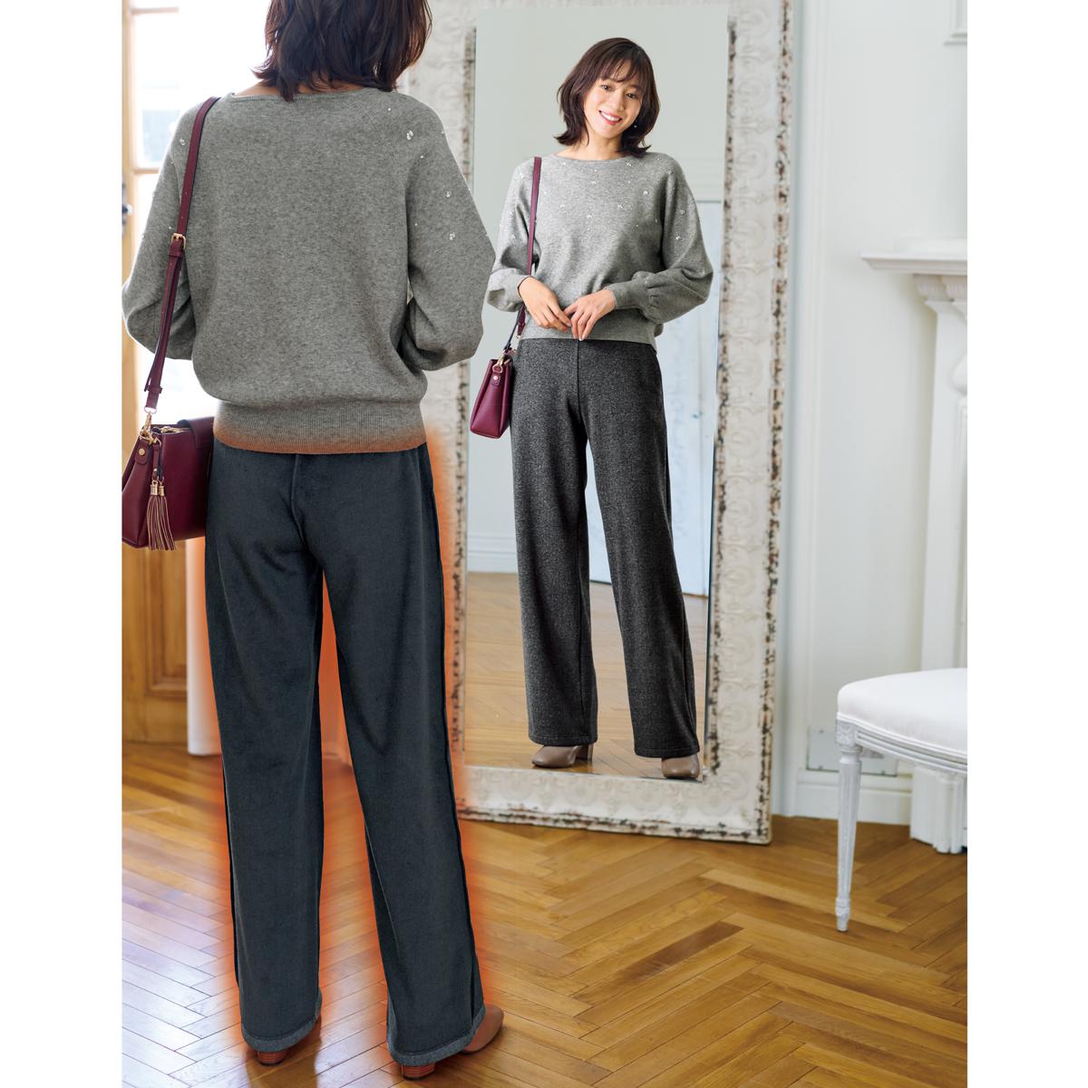 パッと見はきれいなお出かけ服。実は裏シャギーであったかボトム。