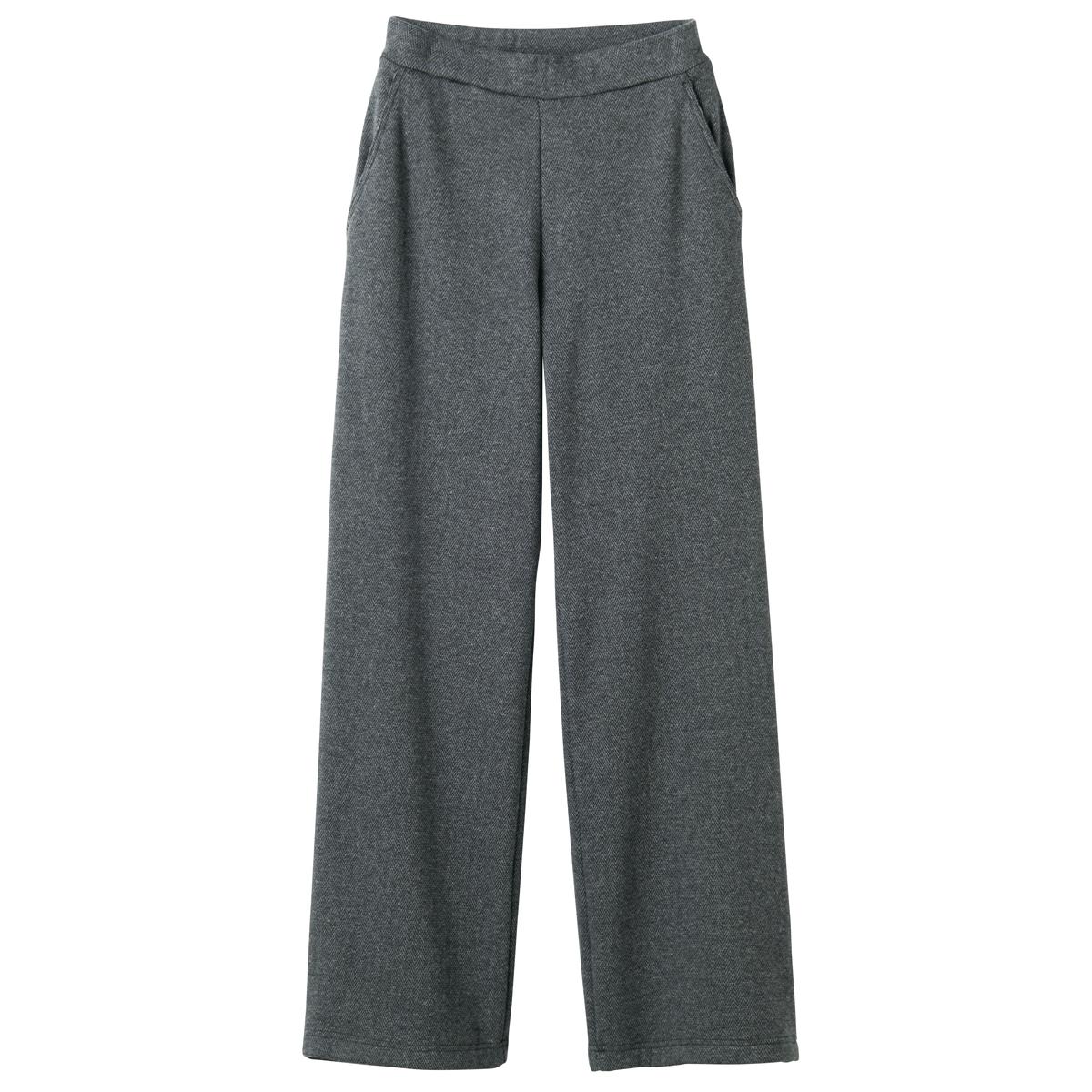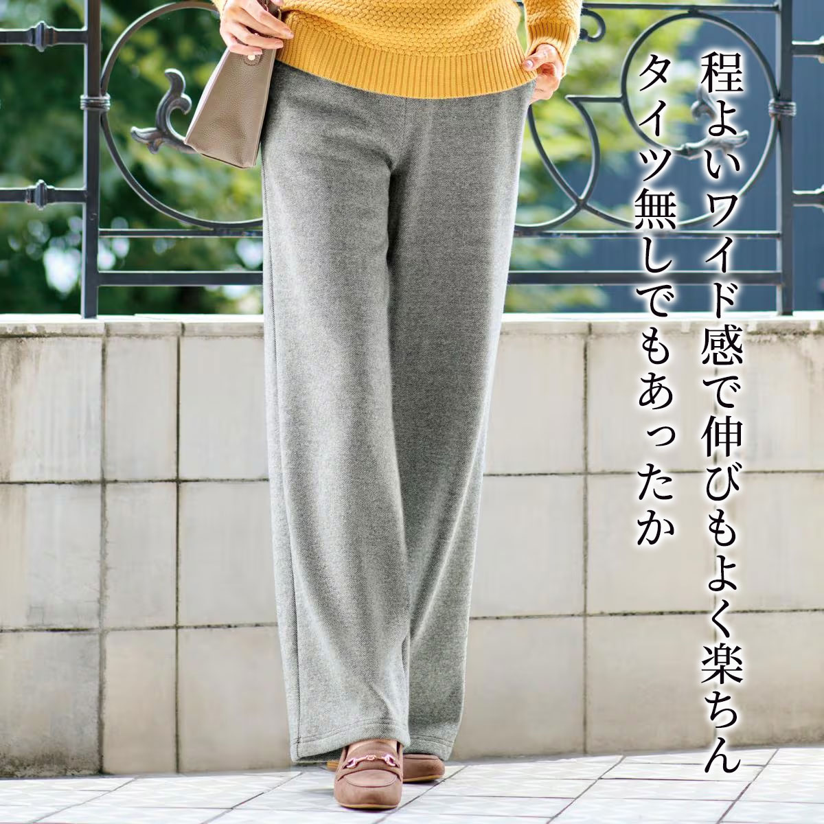 -お買い得ポイント-程よいワイド感で伸びもよく楽ちん!タイツ無しでもあったか♪-デザイン-シルエットはスッキリと足長効果を感じる程よいワイドなライン。ウエストもらくらくな総ゴム仕様で動きやすさ、はきやすさのあるデザインが特徴です。-素材特徴-ツイード見えするカットソージャカード素材。程よく伸びて動きやすい。裏面シャギー素材で、足を通した瞬間からあたたかいので重ねばきいらず。