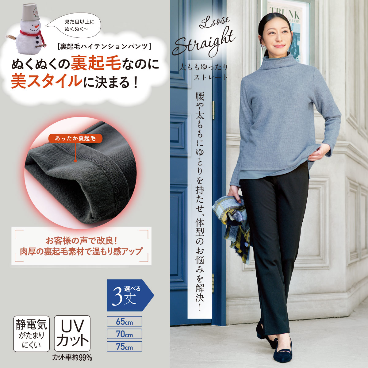 -お買い得ポイント-タテヨコに伸びるストレッチ性と美しくなめらかな表面感で人気のハイテンションパンツの裏起毛付き冬バージョン。お客様の声で改良!肉厚の裏起毛素材で温もり感アップ。-デザイン-太ももゆったりストレート。腰や太ももにゆとりを持たせ、体型のお悩みを解決!ウエスト後ろゴム仕様。-素材特徴-肉厚の生地に改良。静電気がたまりにくい素材にくわえ、UVカットの機能性も♪