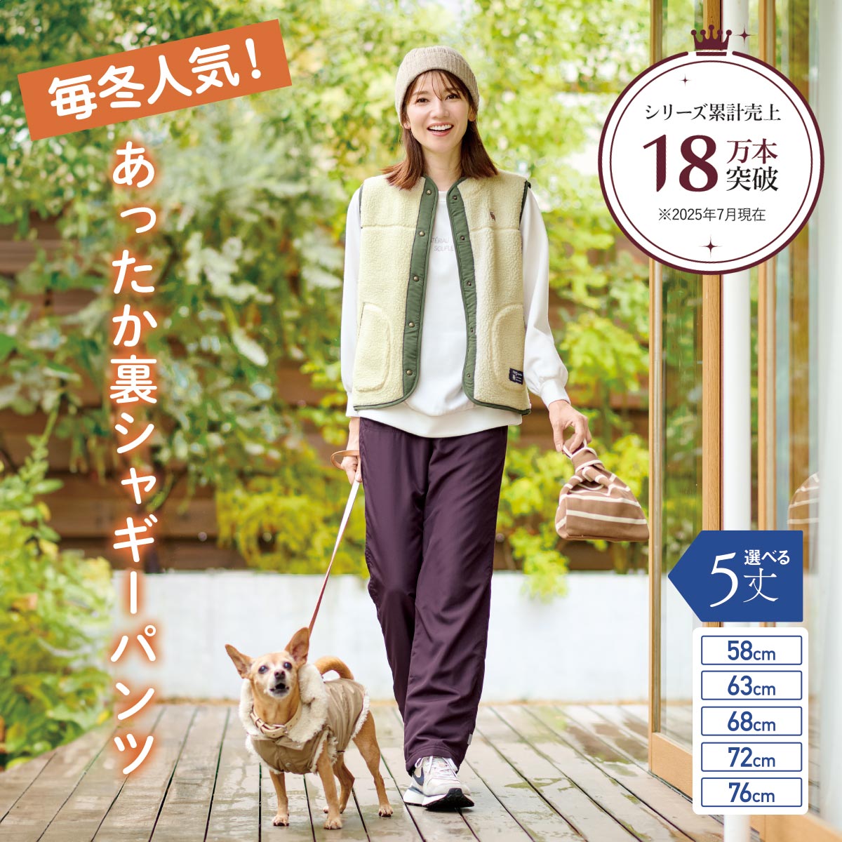 表地は風を通しにくいソフトタフタ素材。裏側全面は肌触りの良いふわふわのシャギー素材パンツ。シャギー部分の裾はゴム仕様で寒い冷気の侵入をシャットアウト。これ一枚あれば防寒に大活躍!ゆったりシルエットだから、スポーツ観戦やお散歩などのアクティブシーンを快適にサポートします。ペットの毛が付きにくいので、愛犬とのお散歩にも!シャカシャカ音がしにくいのも嬉しい!選べる股下5丈展開(股下58cm・63cm・68cm・72cm・76cm)。身長に合わせてお選びください。--------------------------------------◎伸縮性 ☆☆☆☆☆◎生地の厚み ★★★★★--------------------------------------―――――――――――――――――――――――――――――――――――――――――◎すっかり寒くなった朝夕のペットとのお散歩に最適!表地は風を通しにくくペットの毛が付きにくいタフタ素材。◎左裾には反射テープも付いているので薄暗い朝夕も安全!◎表はツルッとしたタフタ素材なので雪かきなどにも着用OK!◎裏側全面は肌触りの良いふわふわのシャギー素材で、おうちの中で着用すれば暖房費も削減できます!◎小柄な方にも嬉しい股下丈58cmもあります!★シリーズ累計18万本突破!(2025年9月現在)―――――――――――――――――――――――――――――――――――――――――■[表地]ポリエステル100%(タフタ)[裏地]ポリエステル100%(シャギーボア)●ウエスト総ゴム仕様・ウエスト内側スピンドル仕様・前左右ポケット・後ろ右ポケット●洗濯機OK●中国製