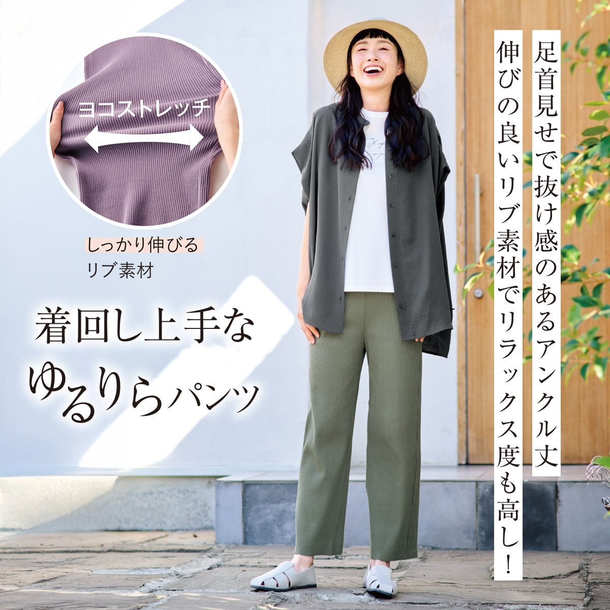伸び伸びリブ素材ではき心地リラックス!アンクル丈が抜け感を演出します。