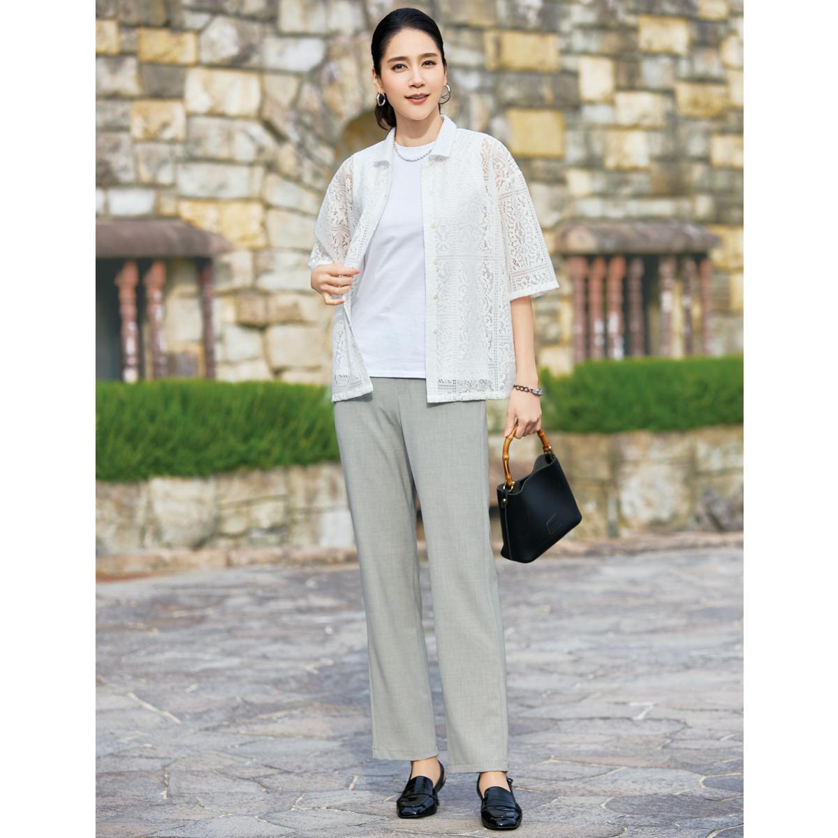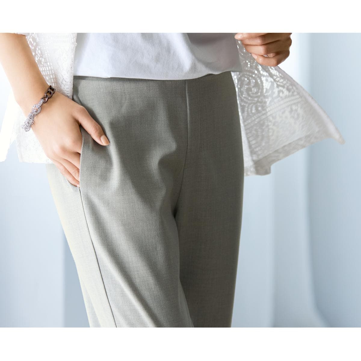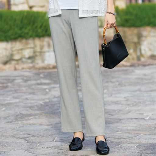 -お買い得ポイント-「キシリトール」配合による清涼感と爽快な肌あたりに加え、UVカット機能も併せ持ち、パンツコーデの鮮度を高めます。-デザイン-ラクな着用感で、すらりと美しい立ち姿を完成させるシルエット。ウエストは、後ろゴム使用でサイズ調整ラクラク。-素材特徴-キシリトール加工をほどこし、ひんやりと清涼感のある肌ざわり。縦横に程よいストレッチで動きやすく軽やか。