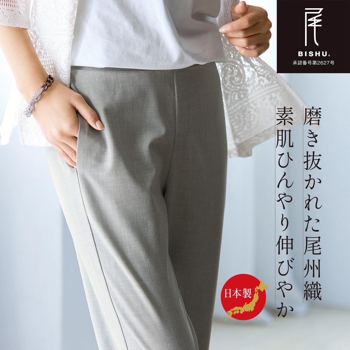 -お買い得ポイント-「キシリトール」配合による清涼感と爽快な肌あたりに加え、UVカット機能も併せ持ち、パンツコーデの鮮度を高めます。-デザイン-ラクな着用感で、すらりと美しい立ち姿を完成させるシルエット。ウエストは、後ろゴム使用でサイズ調整ラクラク。-素材特徴-キシリトール加工をほどこし、ひんやりと清涼感のある肌ざわり。縦横に程よいストレッチで動きやすく軽やか。