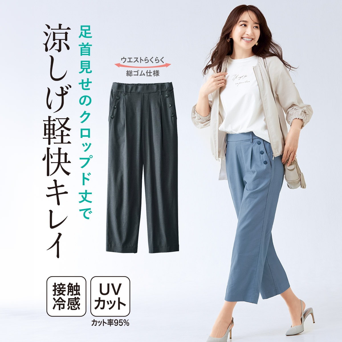 -お買い得ポイント-ゆったりはけるワイドシルエットと、足首が見えるやや短めの丈ですっきり。暑い日に嬉しい涼しいはき心地です。-デザイン-マリンテイストが漂う両サイドのボタンデザインがおしゃれ。ウエストフロント部分はフラットでスッキリ見えるのに総ゴム仕様でラク。-素材特徴-適度に伸びのある素材が動きやすく着心地ラク。