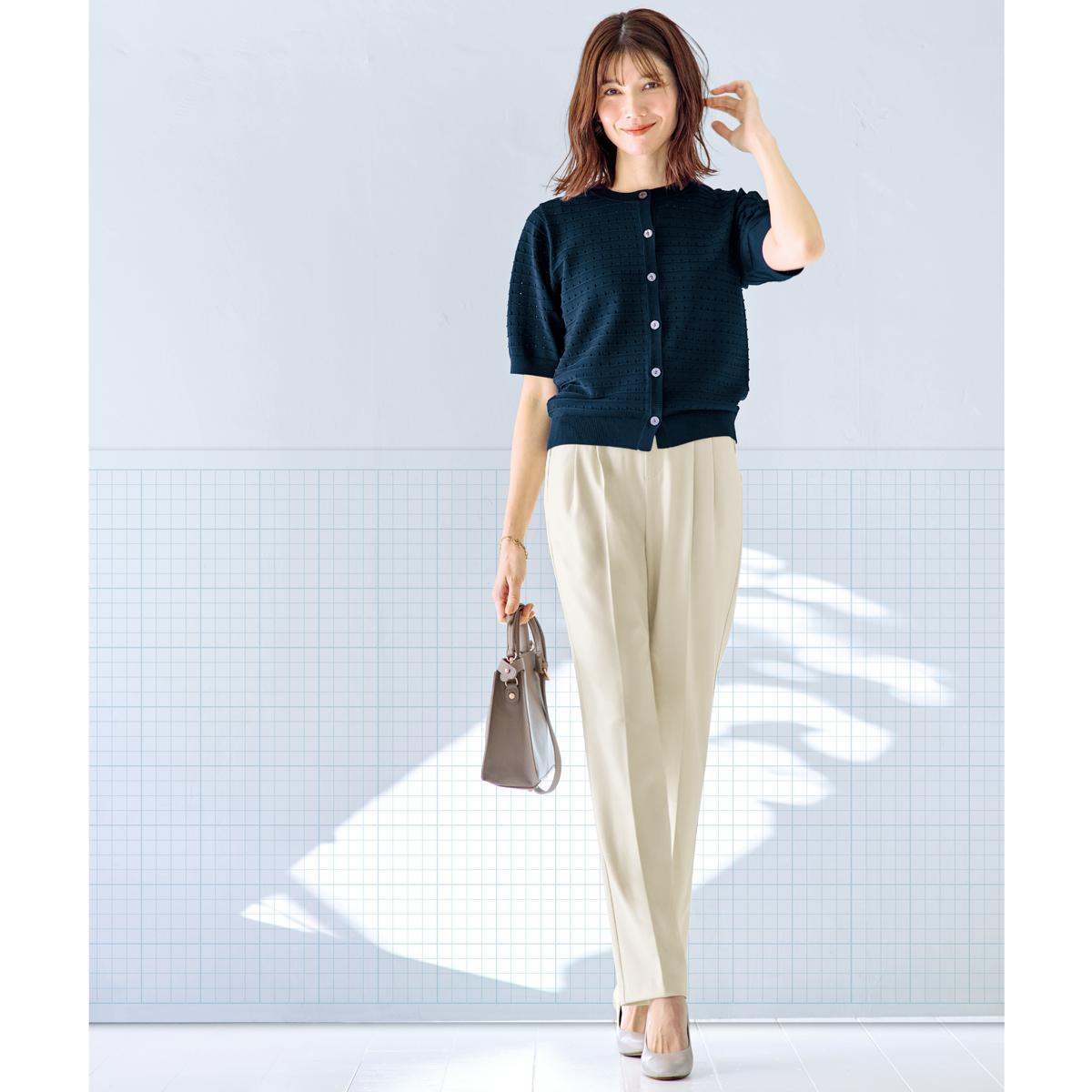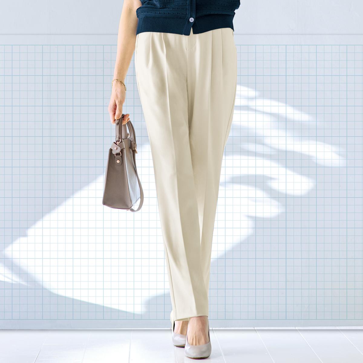-お買い得ポイント-大人世代の体型に合わせ、どの角度から見ても美しいシルエットと心地よさを追究した美脚パンツです。-デザイン-股上や太もも部分に、ゆとりを持たせつつ美シルエットになるよう調整。ヒップの着圧をギャザーの分量で微調整し、適度なゆとりがありつつヒップの位置をアップ。窮屈なベルト部分の位置を上げ、下腹部へのしめつけを軽減し、ラクなのにすっきり。-素材特徴-丈夫さと伸縮性を兼ね備えた素材。洗濯機で丸洗いできるのもうれしい。