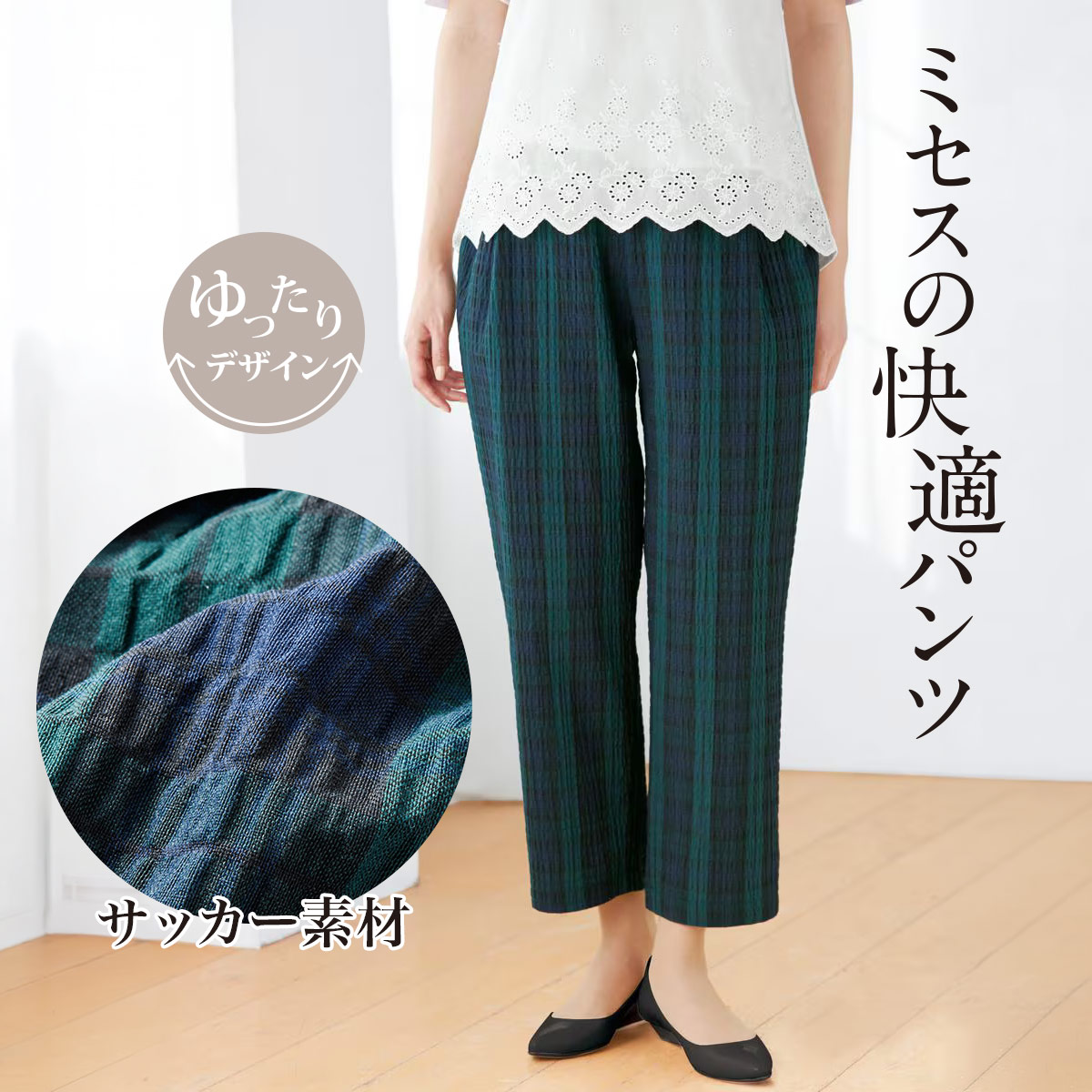 -お買い得ポイント-上品で涼しげなチェック柄のバルーンパンツです。カジュアルなTシャツから、きれいめなブラウスまで合わせやすく、様々なシーンで活躍します。-デザイン-脇寄りのタックでお腹すっきり見えてラク。-素材特徴-凹凸構造により肌との接地面が少なく、汗をかいてもベタつきにくい。