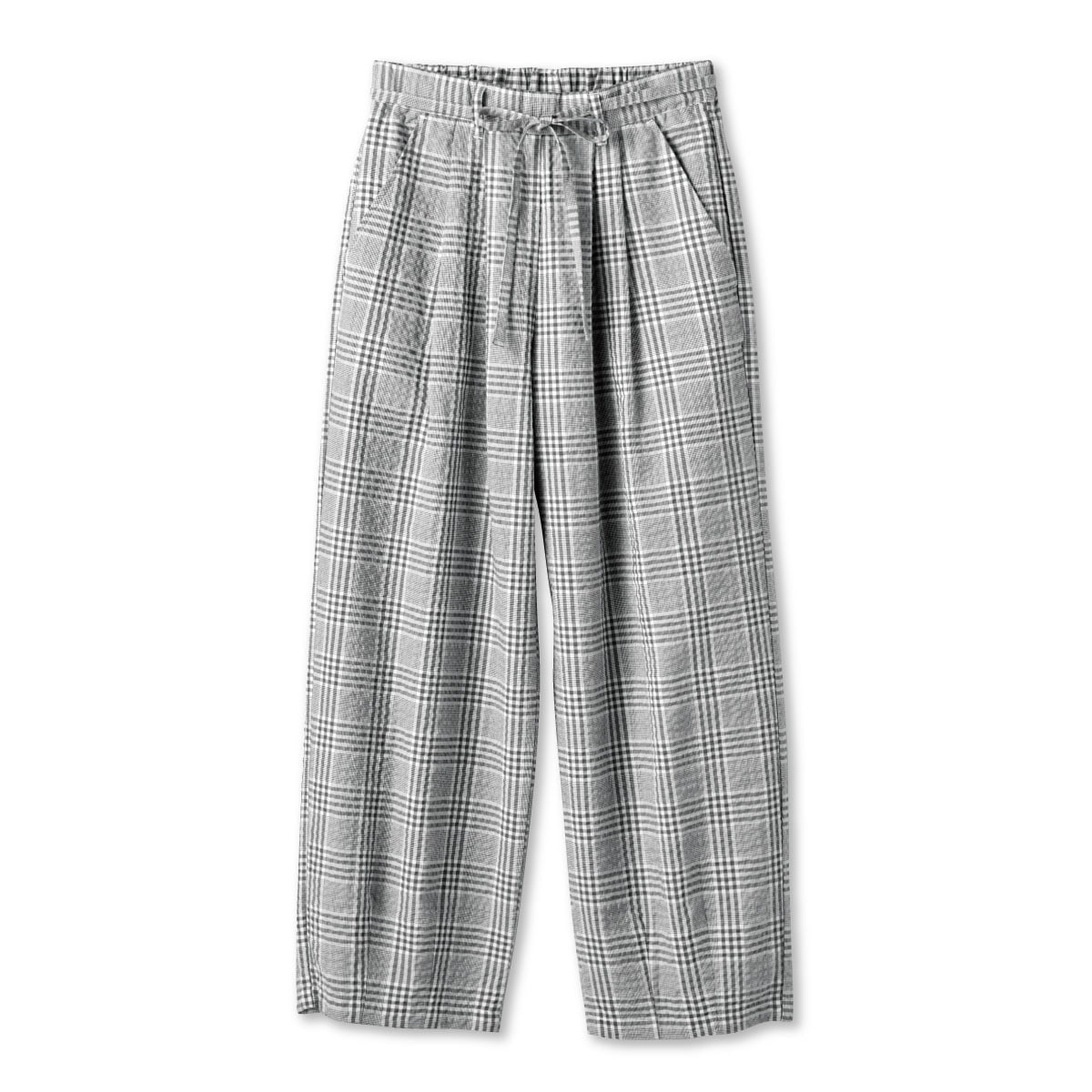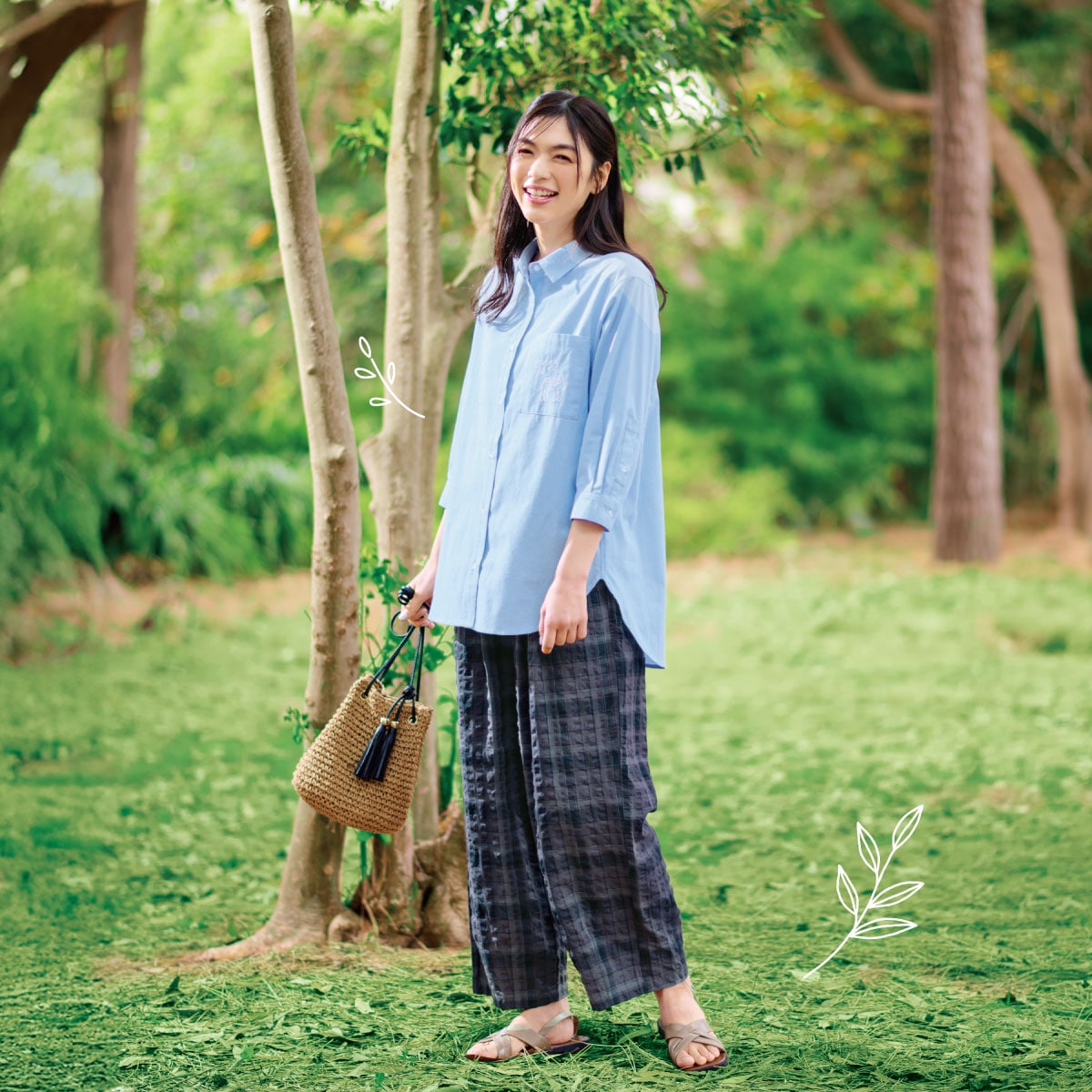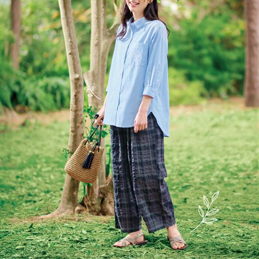 チェックAコーディネート例 足のラインを拾いにくい、サラッと涼しい綿混パンツ。
