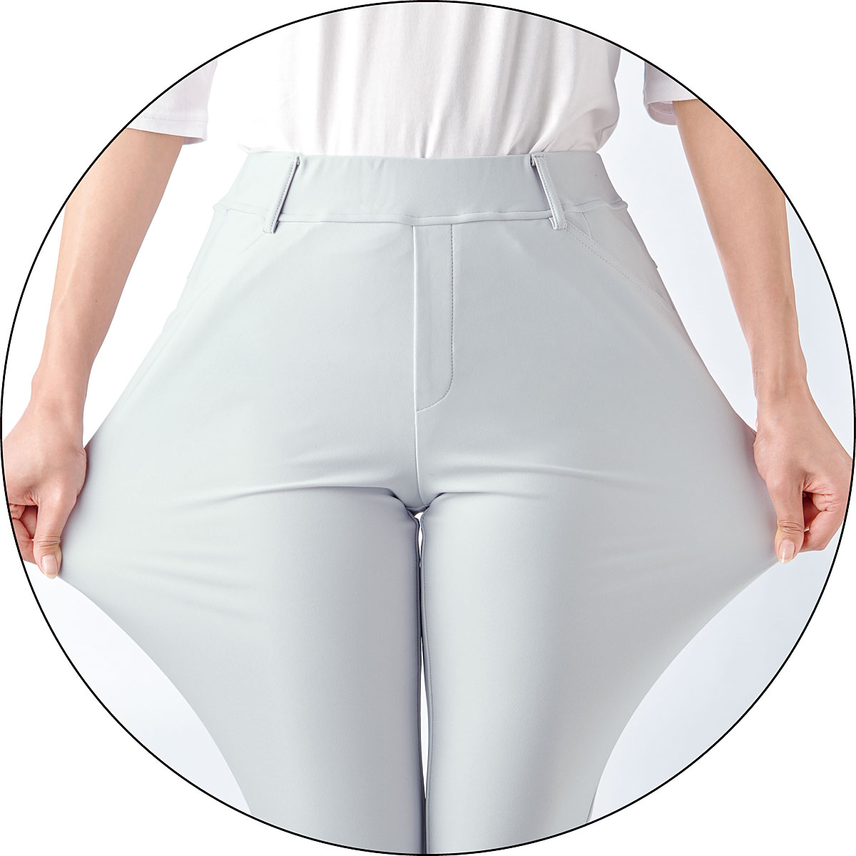 ーお得ポイントータテヨコストレッチと吸汗速乾で楽でサラッとした着心地ーデザインーポケットや飾りひも付きでトップスインでも決まります。ウエストゴム仕様で背中に隙間ができにくくしゃがんでも安心です。深めの後ろ股上でお腹側はもちろん、後ろ側はお尻をすっぽりカバーします。ー素材特徴ー吸汗速乾やUVカットなど夏に快適な素材で洗濯機でも洗えます。ハリのある全方向ストレッチで楽なのに美シルエットをキープ!