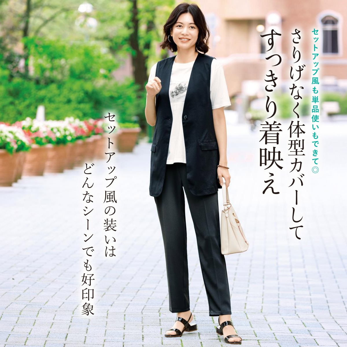 セットアップ風も単品使いもできて◎。さりげなく体型カバーしてすっきり着映え!