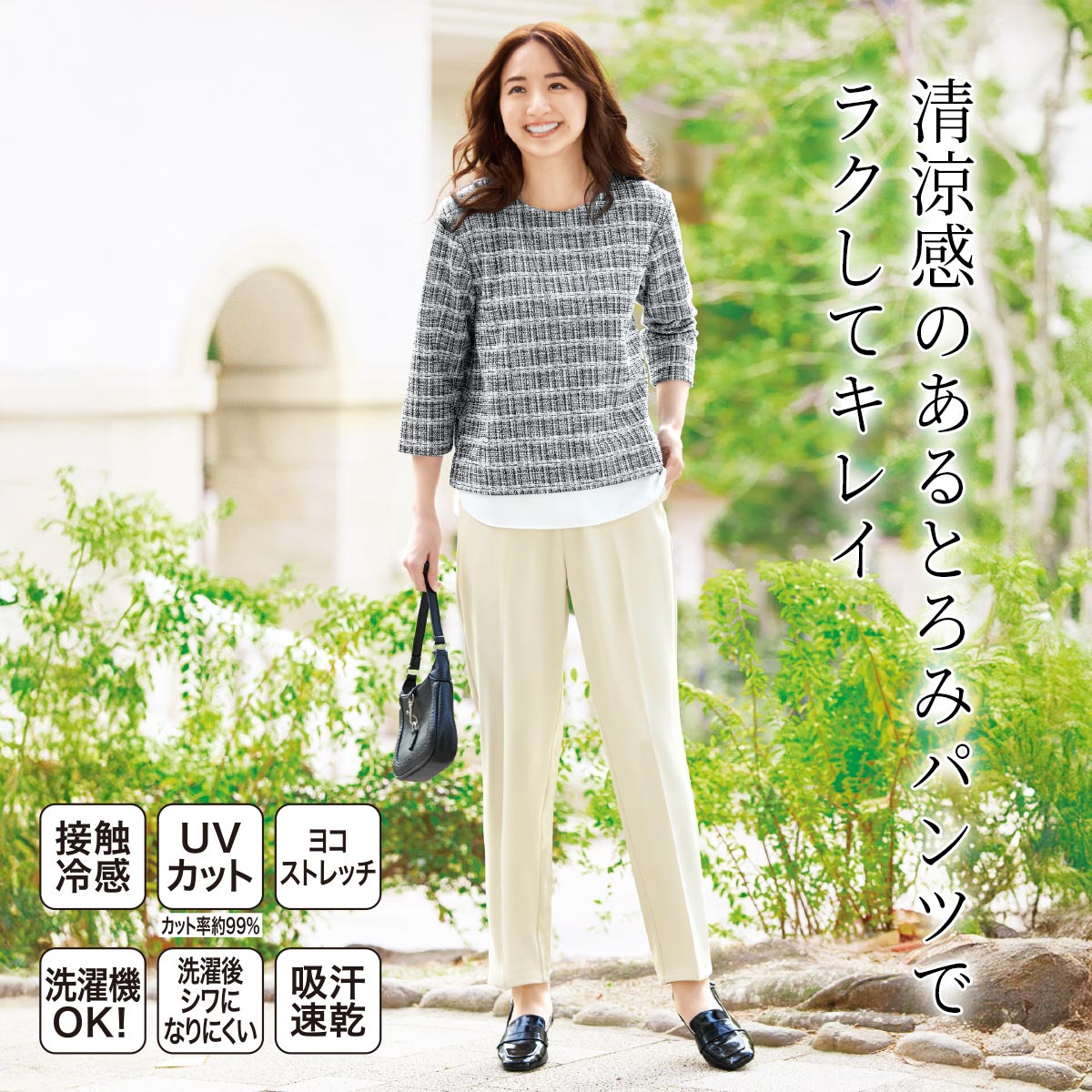 -お買い得ポイント-清涼感のあるとろみパンツでラクしてキレイ。腰回りにゆとりがあり裾に向かって細くなる形状と相まって、美脚効果と快適な着心地を両立し、きれいめなスタイルからオフィスカジュアルまで幅広く活躍します。-デザイン-腰まわりをすっきり見せるノータックデザインと、センタープレスが脚を細見せ。とろみのある落ち感が上品な印象です。-素材特徴-ひんやりした肌ざわりと、とろみ感が心地良く上品に着こなせる。シワになりにくく、洗濯機で洗えるのが嬉しい。