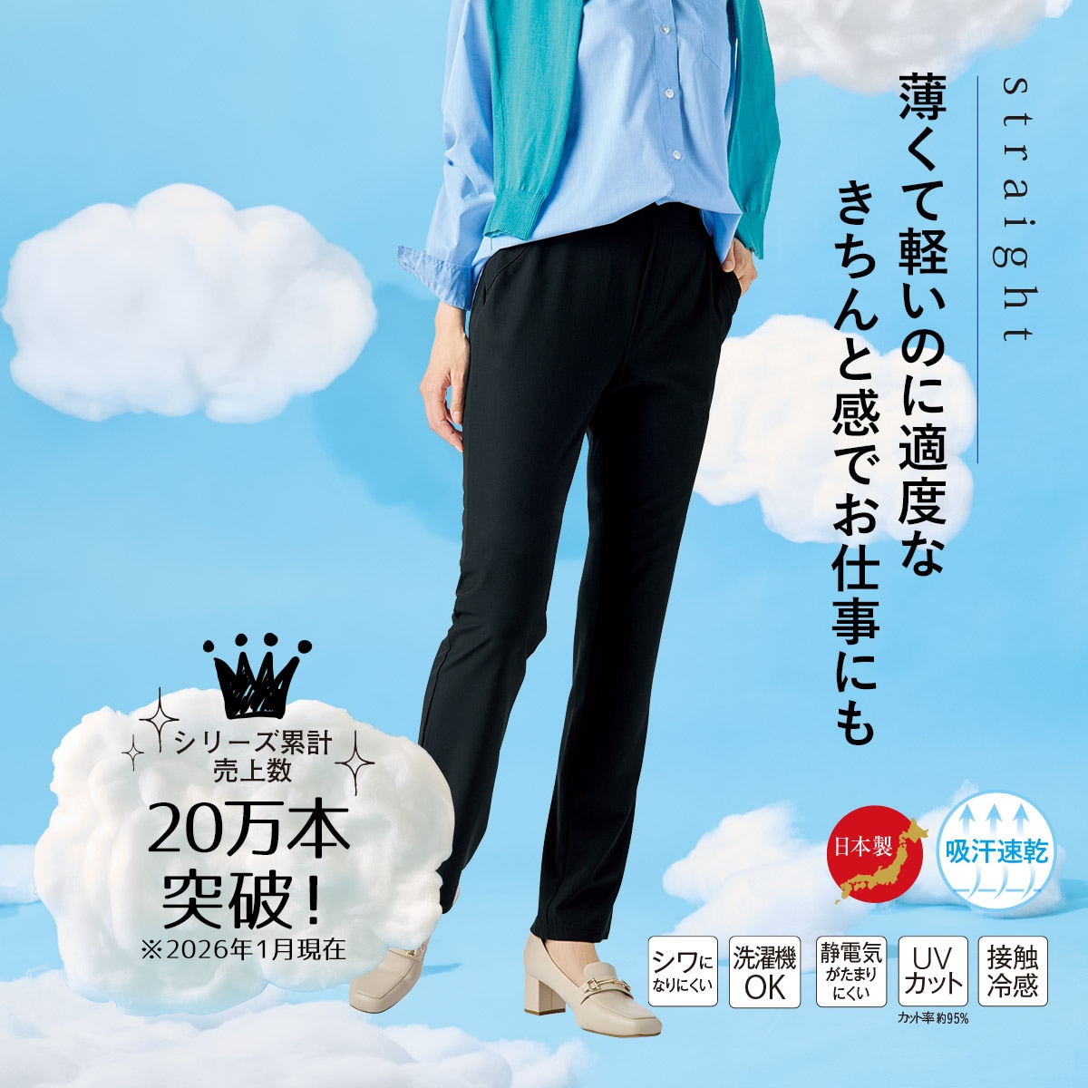 さら軽ストレッチストレートパンツ(日本製・UVカット・接触冷感・吸汗速乾・シワになりにくい・節電対策)