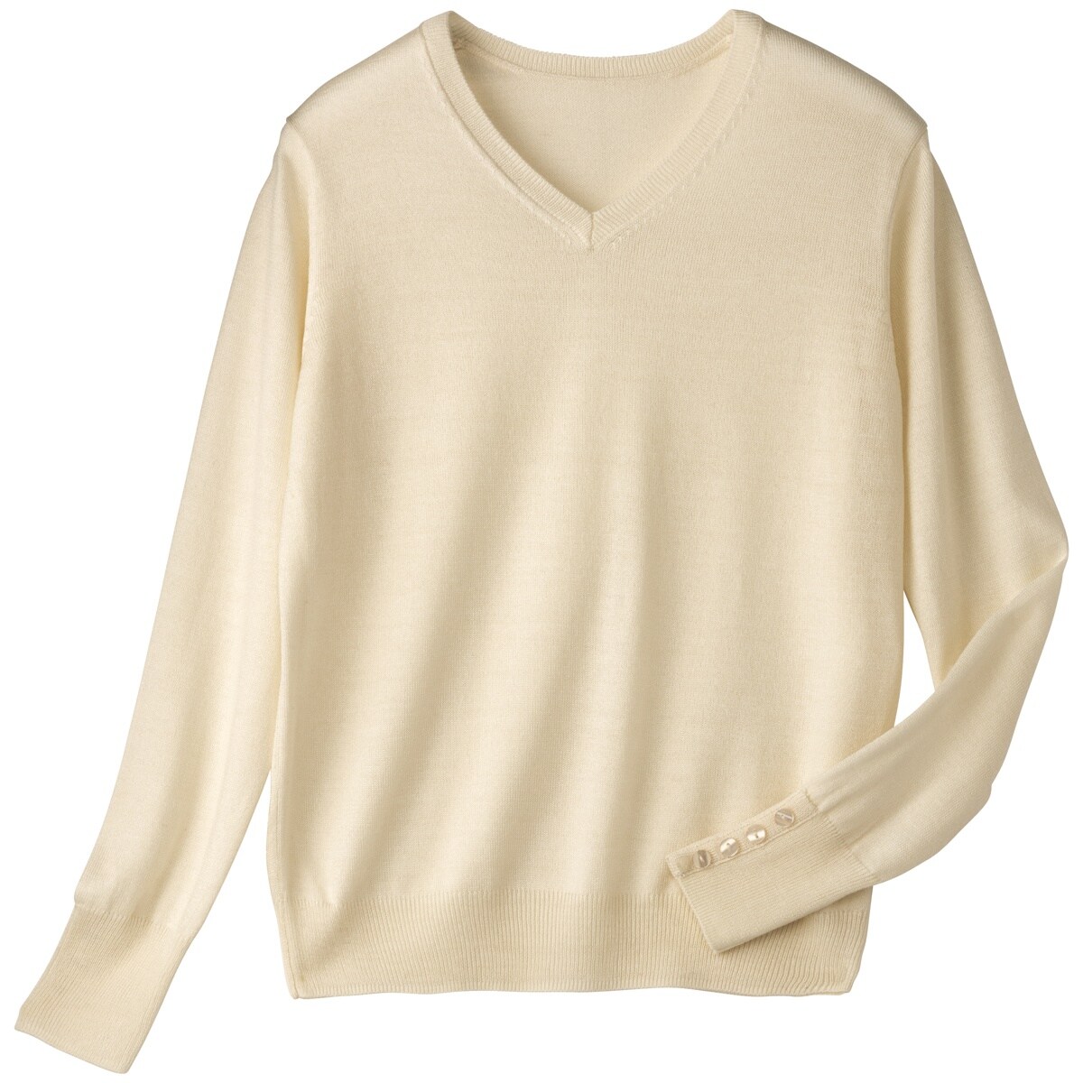 -お買い得ポイント-薄手でやさしく体にフィットする着心地。やや浅めのVネックで衿元が開きすぎず上品な印象に。-デザイン-選ぶのが楽しい5色展開です。長めの袖口リブに並べた同色ボタンがさりげなく新鮮なアクセントを添えて。-素材特徴-ふんわりあったか、なめらかな風合い。ウール混なのにご家庭で洗濯ができるので、簡単に扱えて経済的。