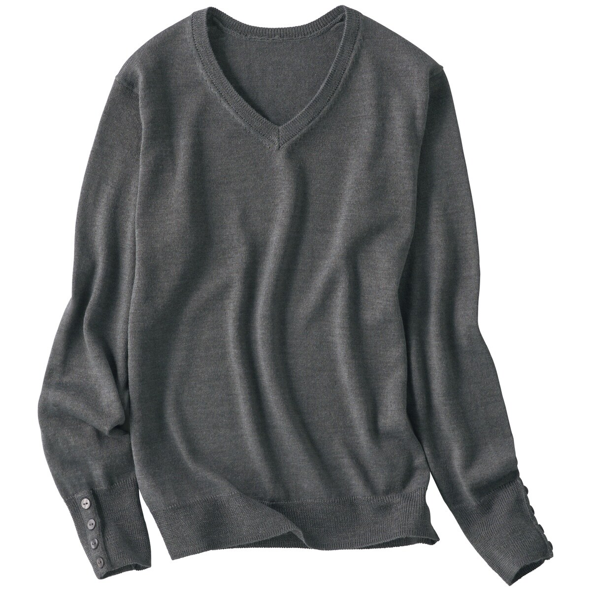 洗濯機で洗えるウール混の上質ニット。程よい開きのVネックは一枚で着ても上品な印象に。きれいめ定番アイテムながら、袖口リブのボタン使いが小粋なアクセント!