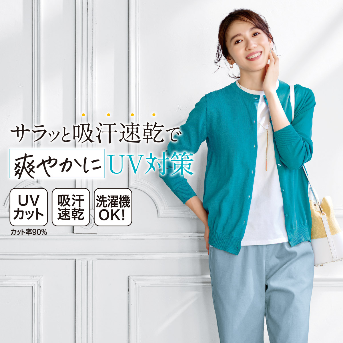 -お買い得ポイント-きれいめにもカジュアルにも着まわしやすいクルーネックカーディガンです。前を閉じればプルオーバー風にも着られます。-デザイン-明るい3色とシックな3色の選べる6色をラインアップ。-素材特徴-日差しから肌を守ってくれるUVケア機能付きの生地は、薄手でサラッとした肌ざわりです。洗濯機で洗えて便利!