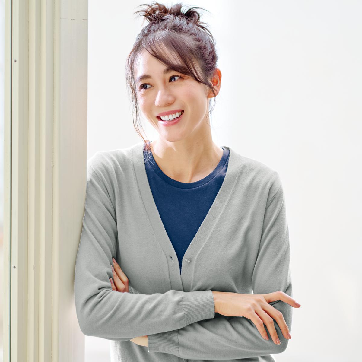 きちんと見えを叶えるカーディガン 一般的なニットは1本から2本の糸を撚り合わせて編まれますが、この商品は3本の糸を撚り合わせて編んでいます。しなやかでハリ・コシのある独特の風合いが楽しめます。