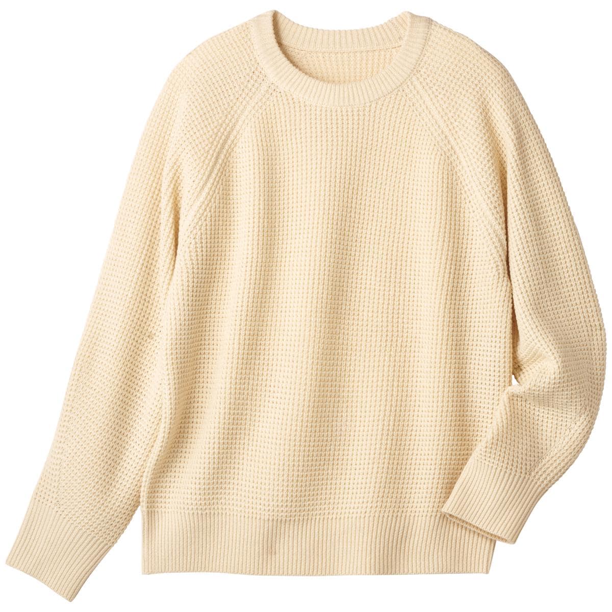 ふんわりワッフル編みがやさしげなローゲージニット。甘めの色味で好印象に。