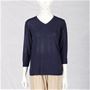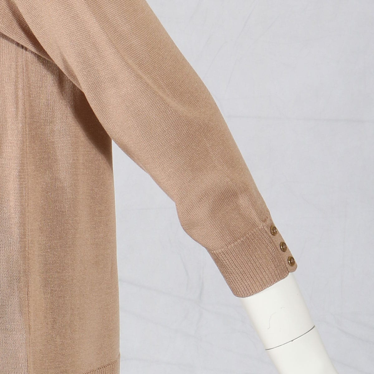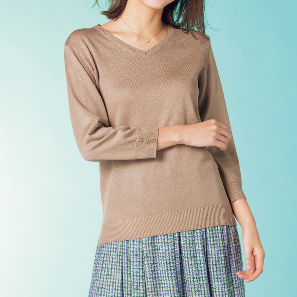 -お買い得ポイント-7分袖で腕の華奢見えを叶え、ほんのり透け感もあるので、涼しげに着こなせます。-デザイン-1枚あると便利なシンプルデザイン。肌見せを抑えた浅めのVネックと、からだのラインを拾いにくいサイズ感に仕上げました。袖口のゴールド調縁のボタンがアクセントに。-素材特徴-ドライなタッチで涼しく、毛玉にもなりにくいシャリ感のあるリネン風ニット。自宅で洗濯できるので普段使いに重宝します。