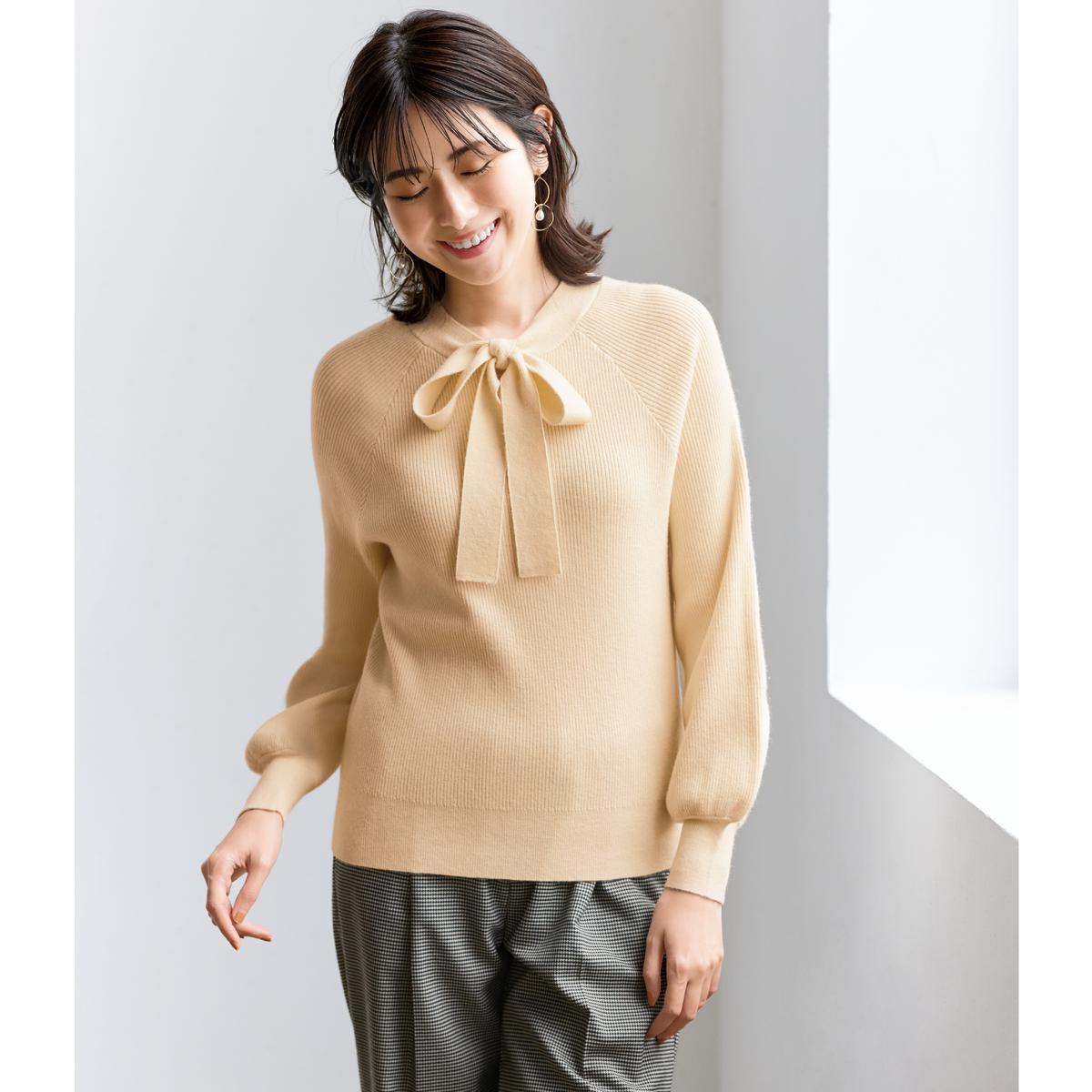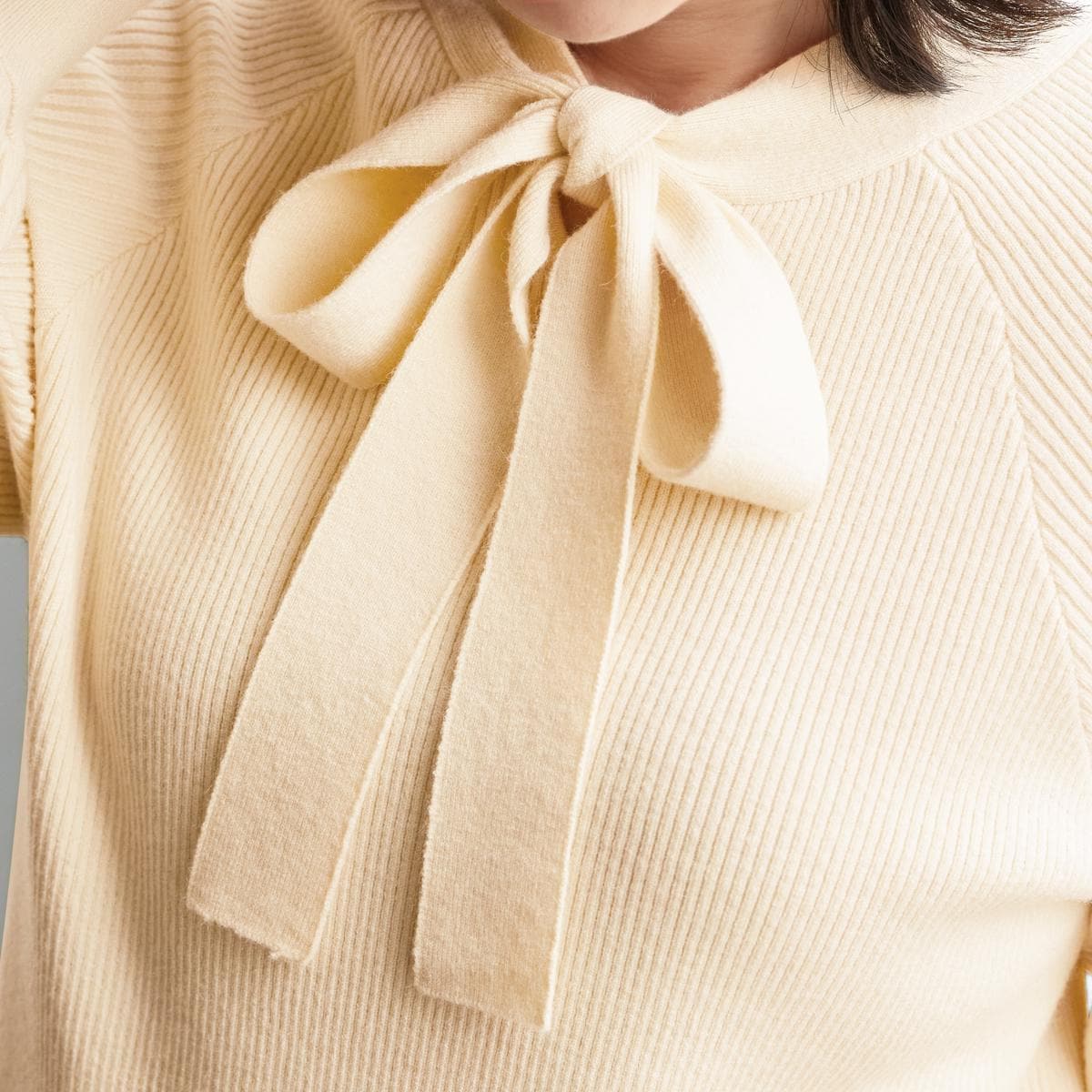 -お買い得ポイント-顔まわりを華やかに彩り、アクセサリーいらずで存在感を放つやわらかニット。-デザイン-大き目のリボンが顔まわりに華やぎをプラス。細リブが体のラインを拾いにくく、程よいフィット感でスタイルアップを叶えます。-素材特徴-程よい弾力性のある微起毛ニット素材。柔らかくでもちっとした、ずっと触れていたくなる肌ざわりです。