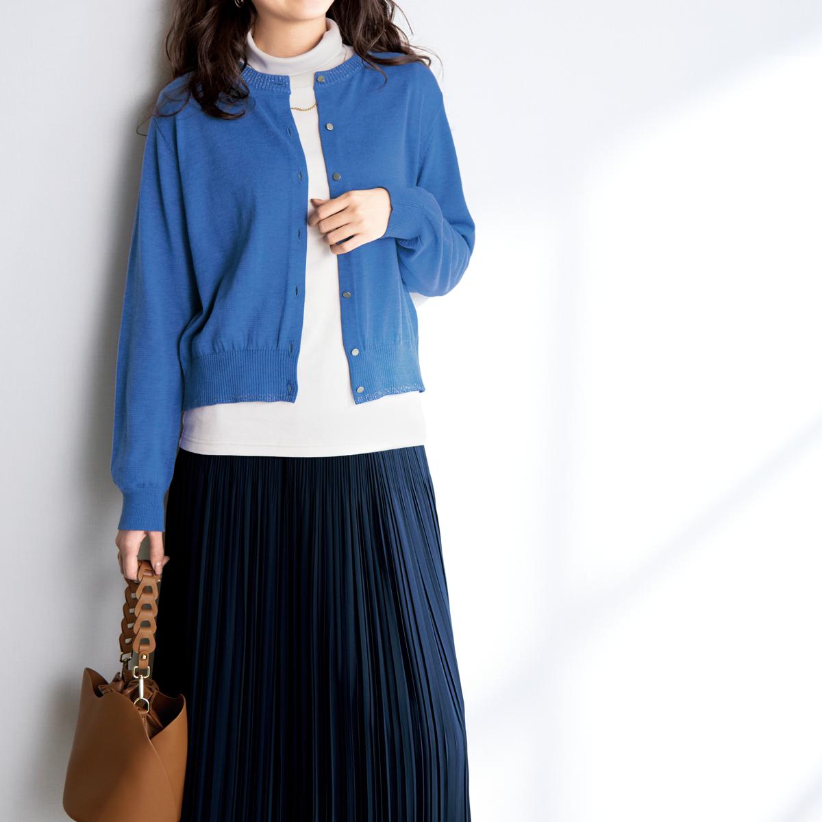衿元と裾にラメ糸を使った華やかベーシックカーディガンです。季節を越えて着回したいこだわりが光るラクロン素材でお手入れ簡単