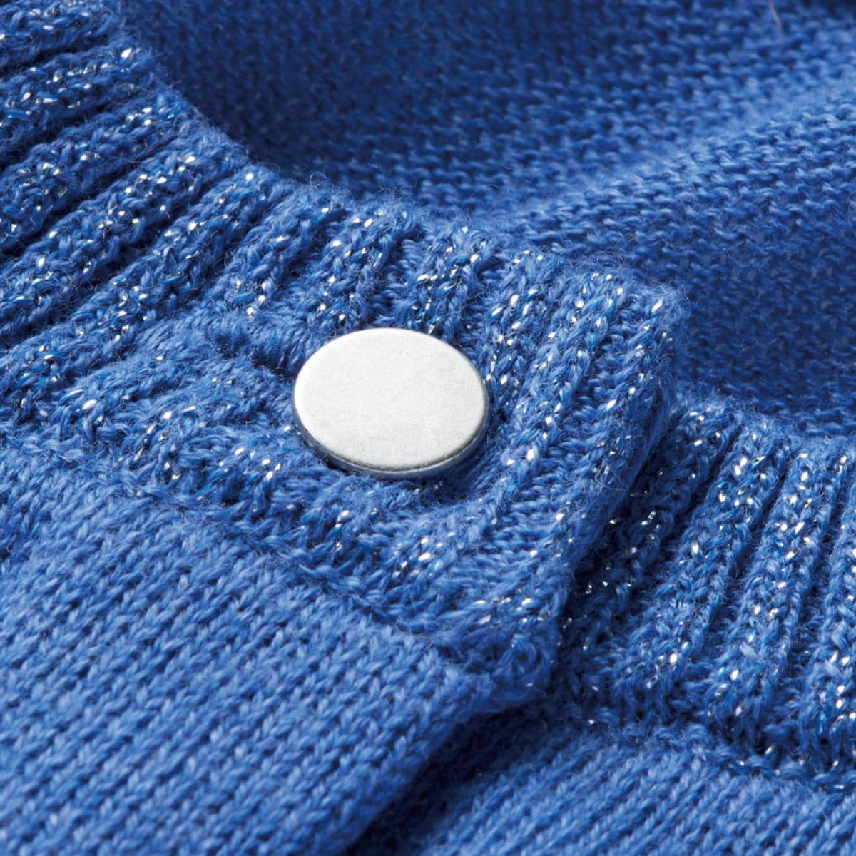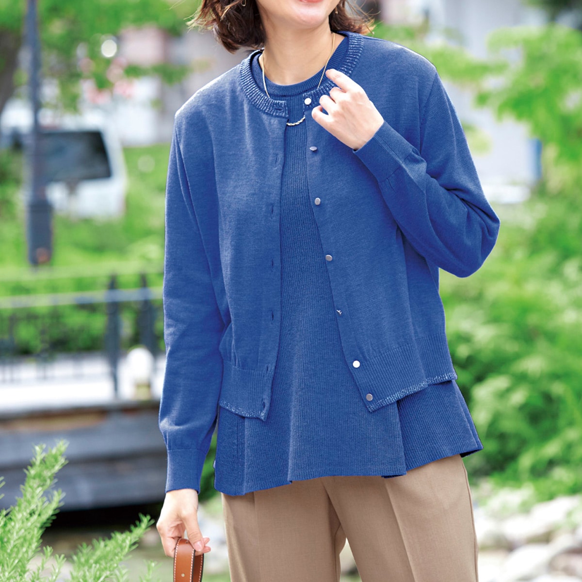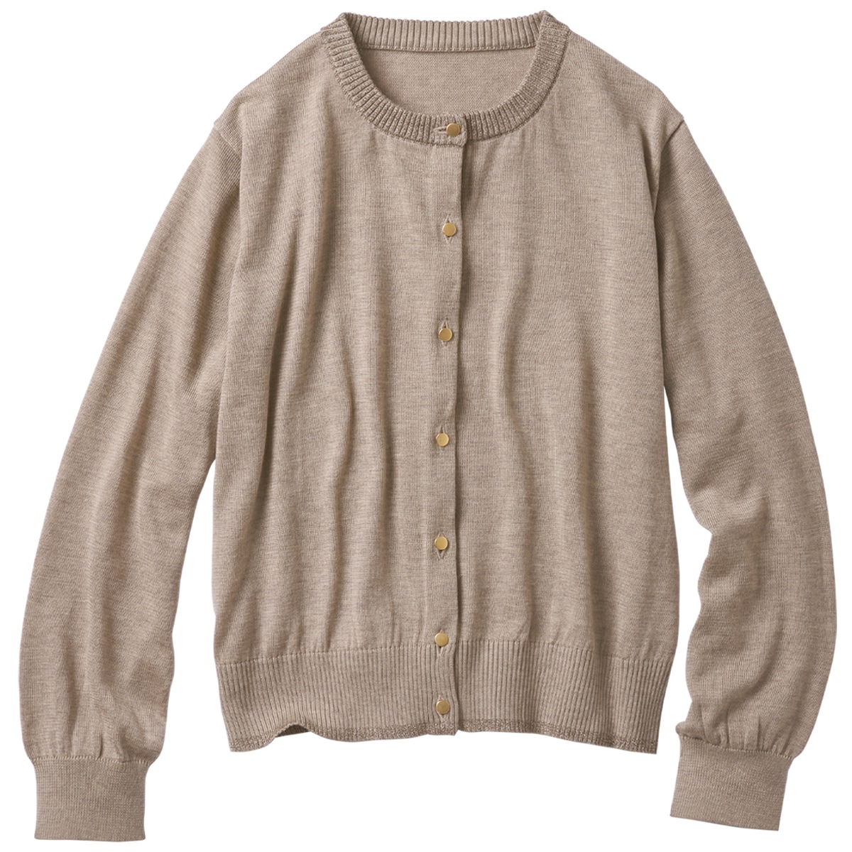 -お買得ポイント-ディープブルーはシルバーカラー、モカベージュはゴールドカラーと、ボタンに合わせた色使いのラメ糸がアクセントに。-デザイン-季節の変わり目に嬉しい軽くて着回ししやすいカーディガン。ベーシックなデザインに、衿ぐり、裾のラメ使いがおしゃれ度UP。-素材特徴-洗濯機で洗えて、乾きが早くしわになりにくい!お手入れ簡単なポリエステル素材なのにコットンのようなナチュラルな風合いで、さらっとした着心地が特徴のラクロン生地です。