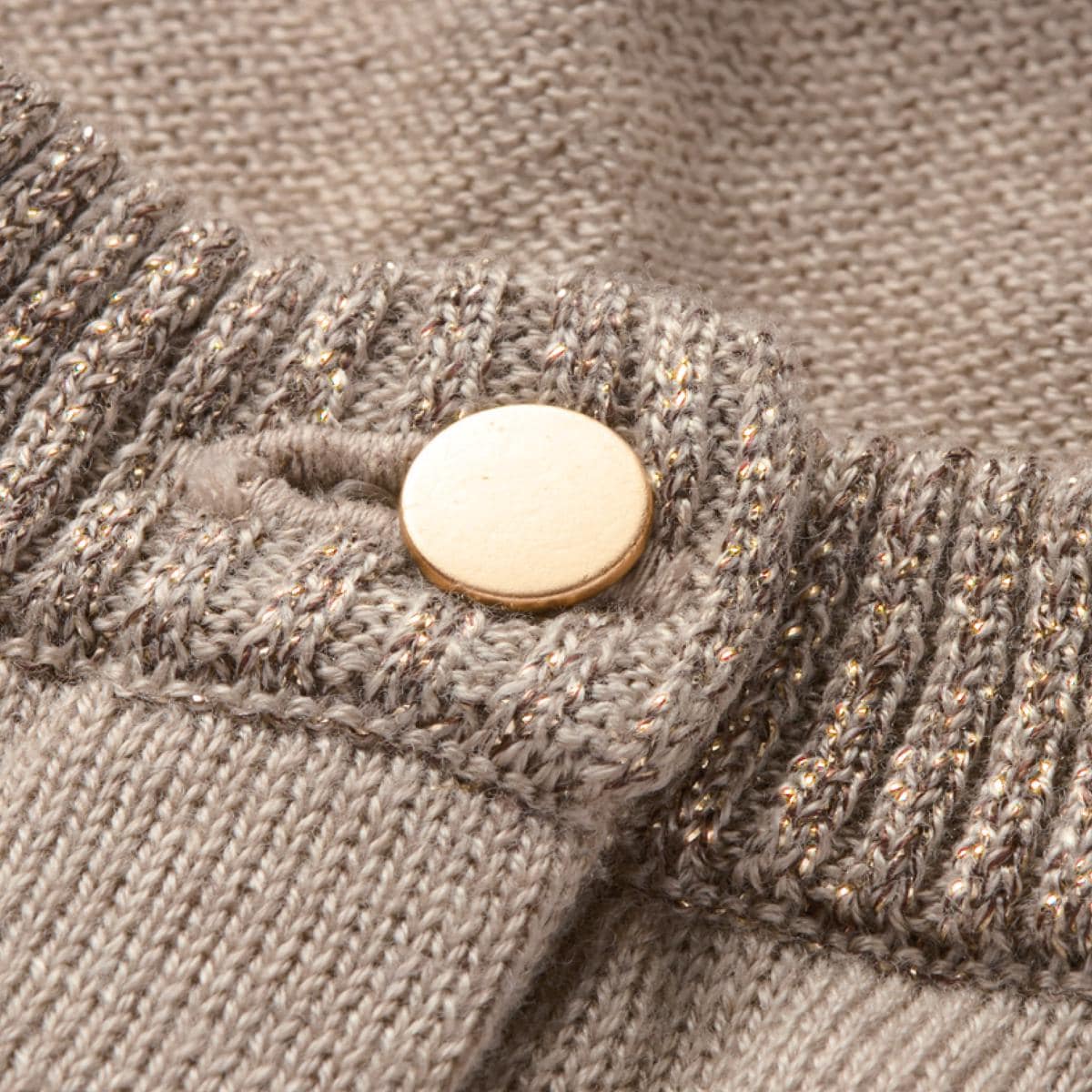 モカベージュはゴールドカラーのラメ糸使用。ゴールドカラーのボタンに合わせた色使いのラメ系がポイント