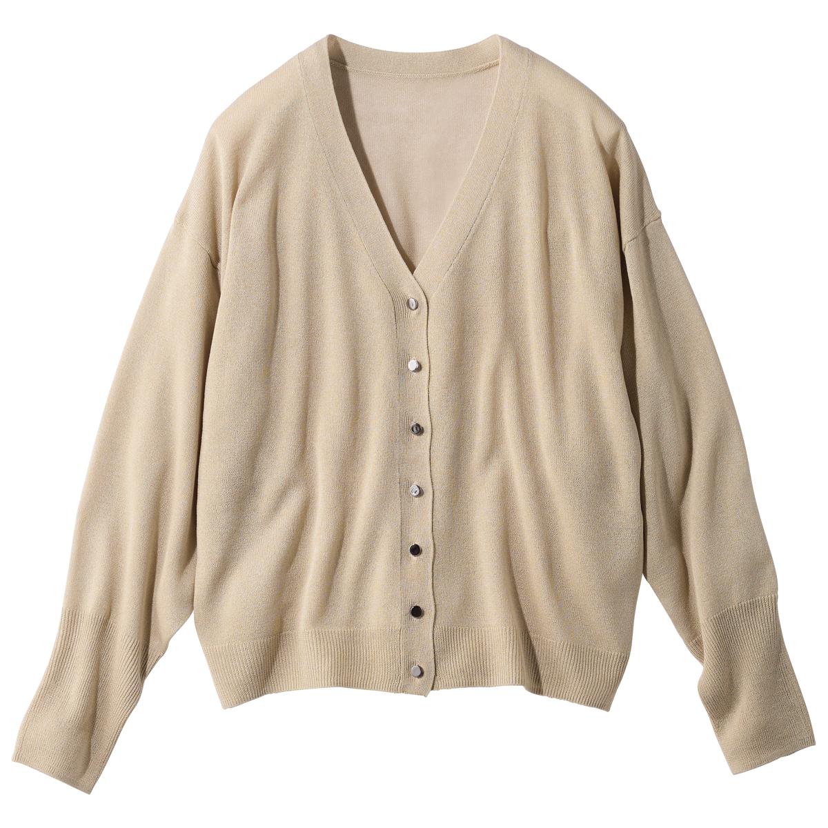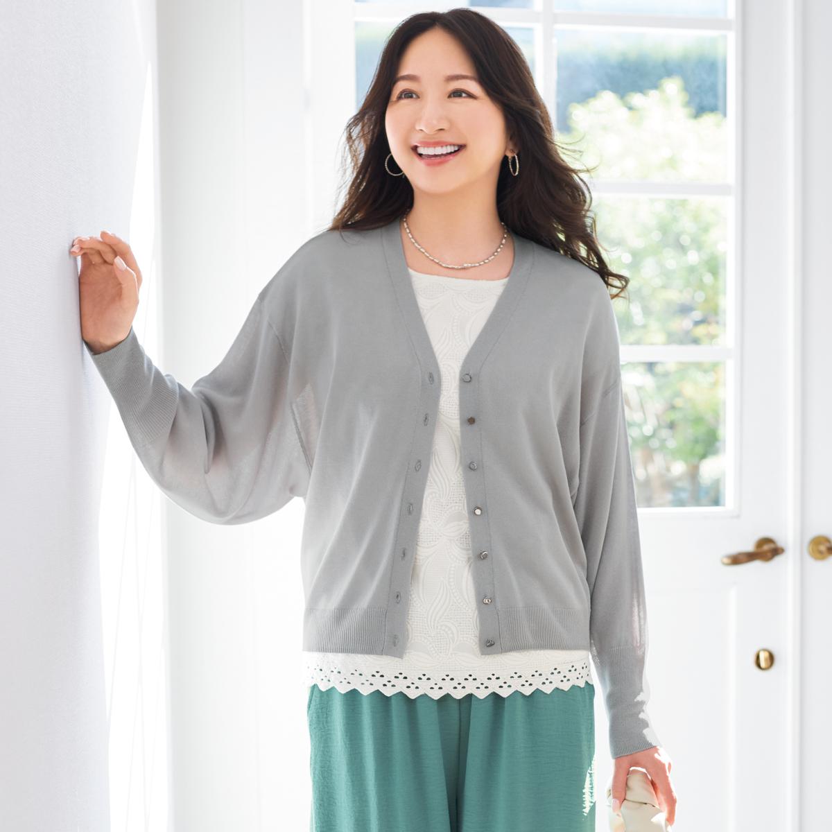 -お買い得ポイント-肌寒いときにおすすめのさっと羽織れる薄軽カーディガンです。-デザイン-Vネックとボリューム袖で快適な着心地です。-素材特徴-薄手で軽く程よい透け感の天竺編みニット。肌離れがいいので、べたつかず着心地◎。小さく畳める薄手素材は持ち運びラク。