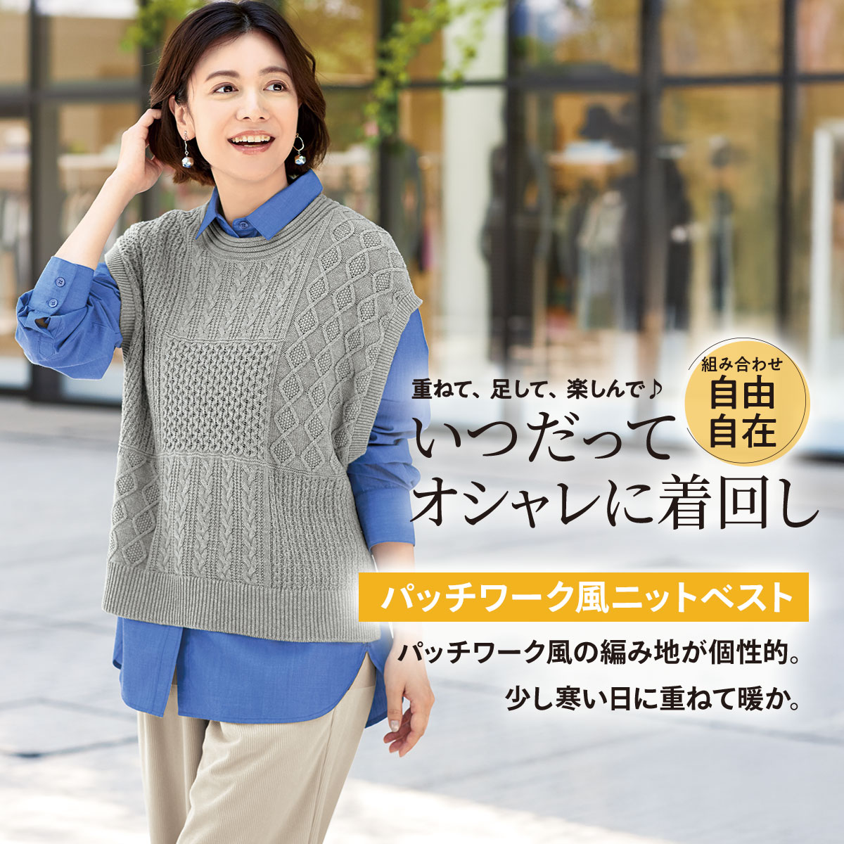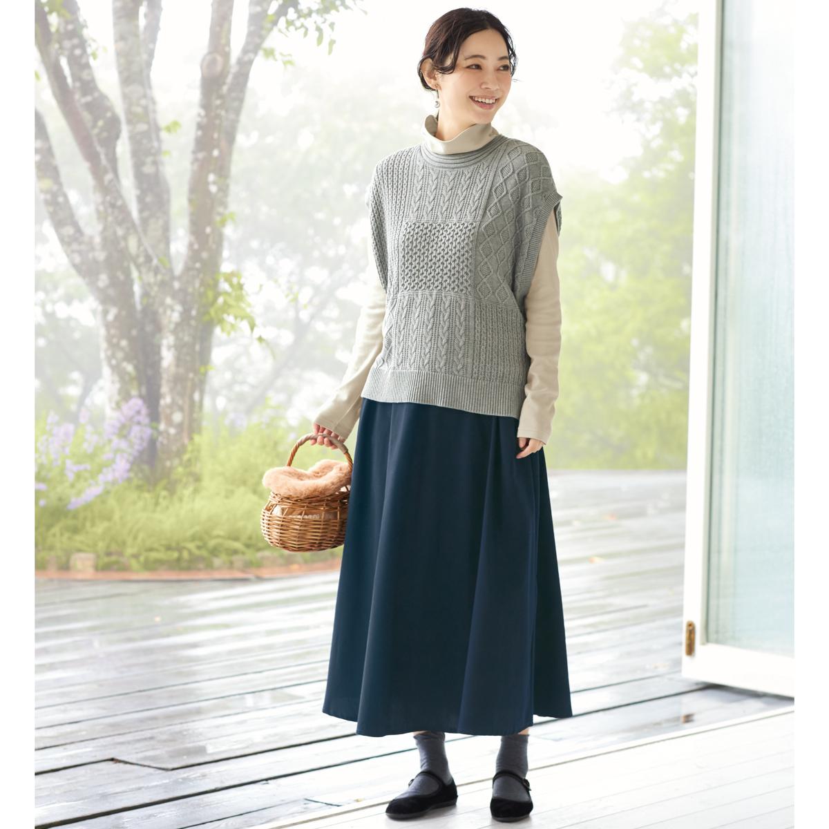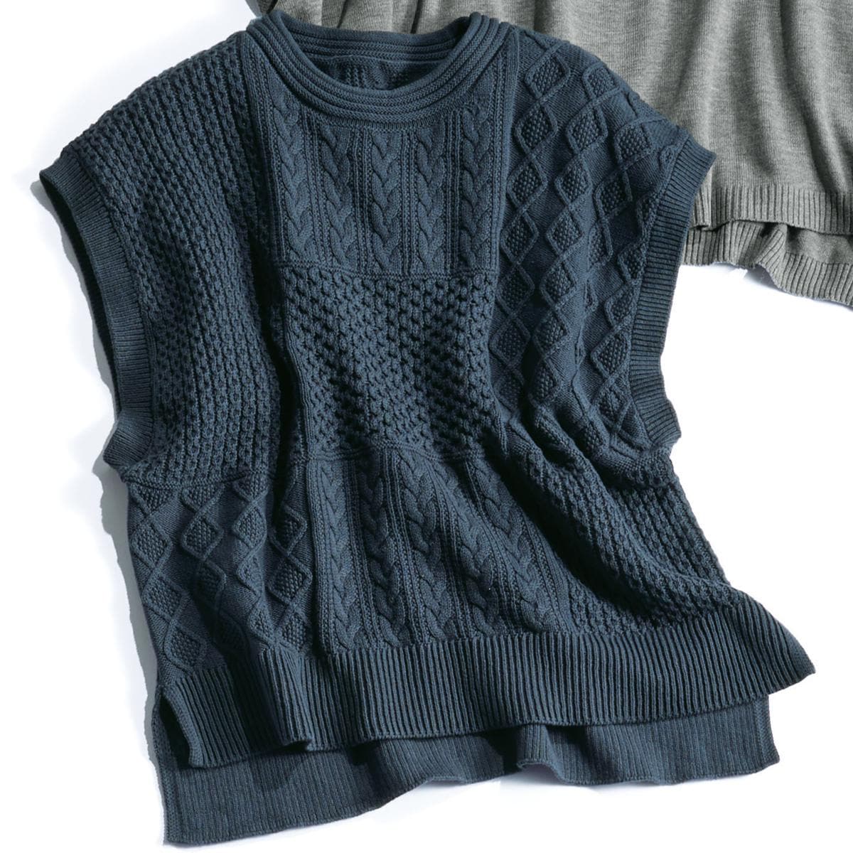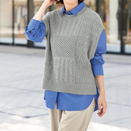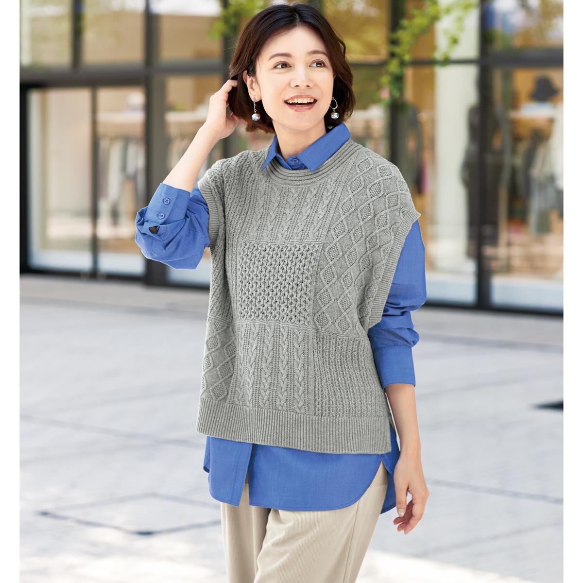 -お買い得ポイント-端境期に重宝するニットベスト。-デザイン-パッチワーク風の編み地が個性的です。くるんとしたロール仕上げの衿ぐりがアクセント。-素材特徴-心地良い肌ざわりの綿混素材