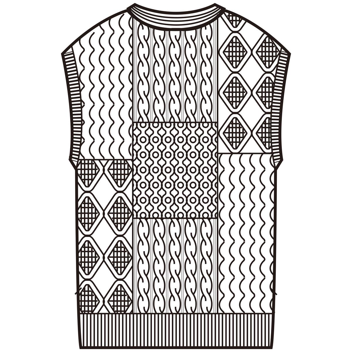 端境期に重宝するニットベスト。パッチワーク風の編み地が個性的です。