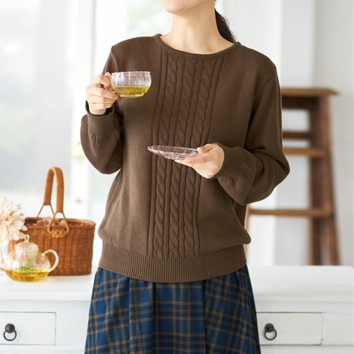 着ぶくれしにくい、しなやかな肌ざわりの薄手ニット。アウターを羽織ってもセンターのケーブル柄がチラ見えして、おしゃれ感がアップします。
