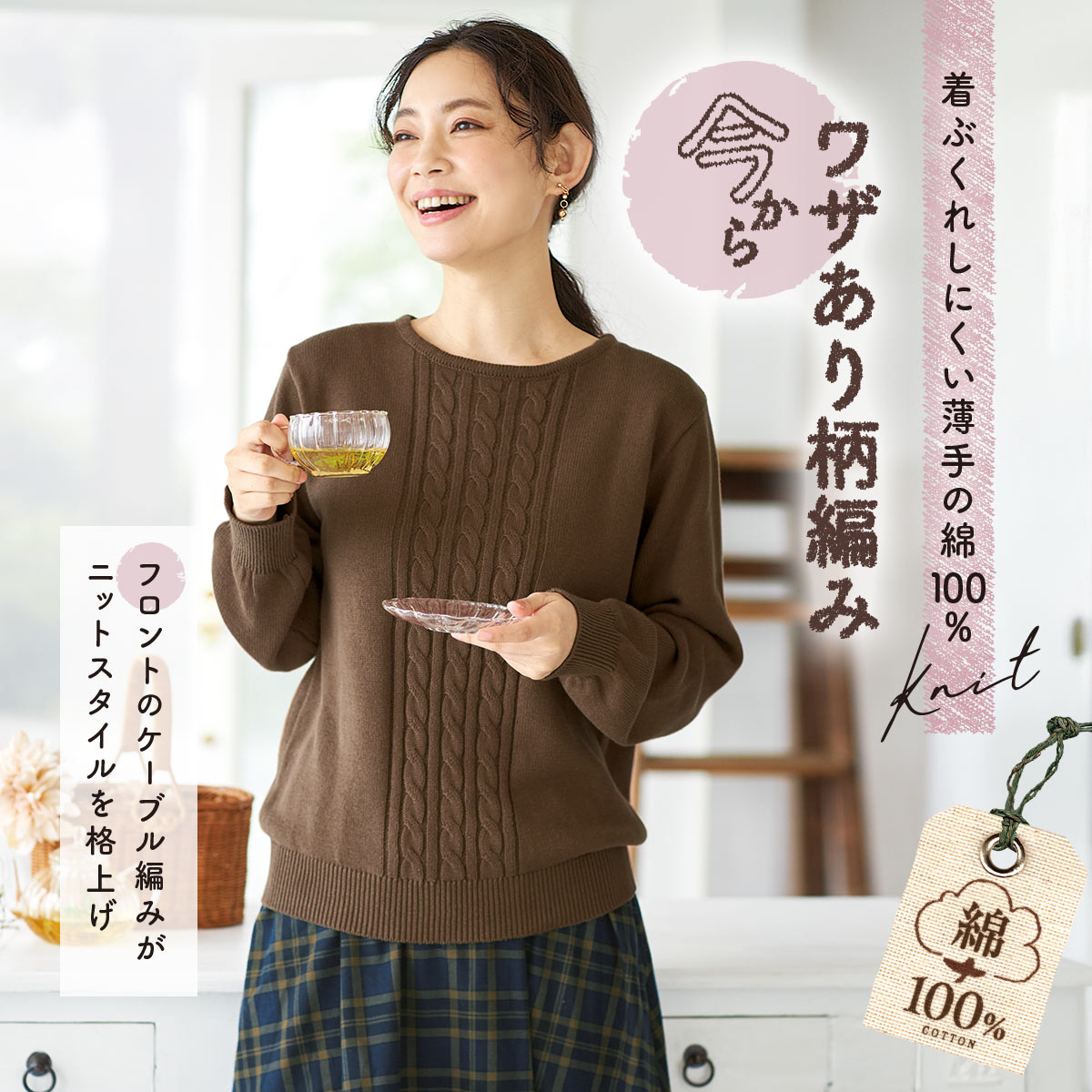 -お買い得ポイント-アウターを羽織ってもセンターのケーブル柄がチラ見えして、おしゃれ感がアップします。-デザイン-フロントのケーブル編みがニットスタイルを格上げします。シンプルなデザインなので、コーディネートしやすいのも嬉しいポイント。-素材特徴-優しい肌あたりの綿100%ニット。着ぶくれしにくい薄手の素材なので1枚でも、重ね着でも長く着られます。